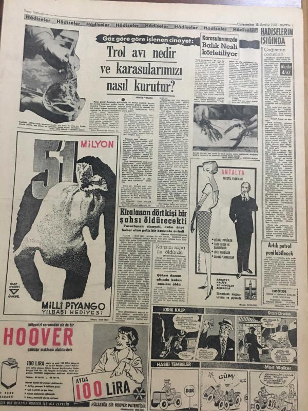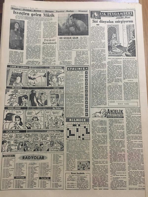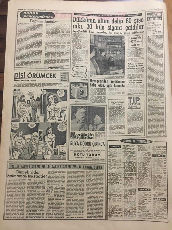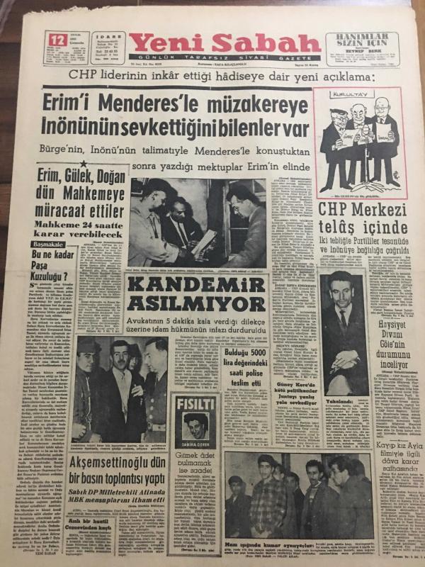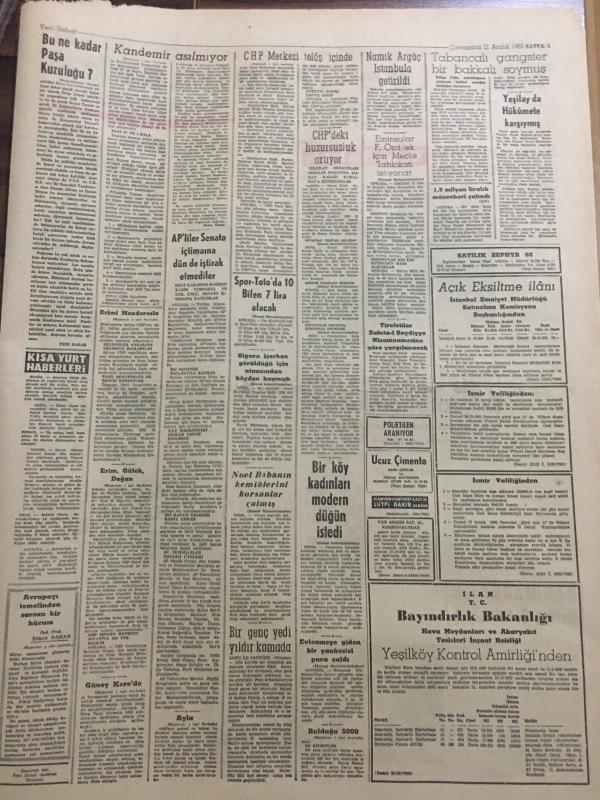 YENİ SABAH GAZETESİ 12 ARALIK 1962 YIL :25 SAYI :8532---Erim 'i Menderes 'le Müzakereye İnönü 'nün Sevk Ettiğini Bilenler Var--Erim , Gülek ,Doğan düb mahkemeye müracaat ettiler --Kandemir Asılmıyor ---CHP Merkezi Telaş İçinde --Akşemsettinoğlu dün bir basın toplantısı yaptı --Dükkanın altını delip 60 şişe rakı ,30 kilo sigara çaldılar --Trol avı nedir ve karasularımızı nasıl kurutur ?--Sinema :İsveç 'ten gelen müzik ,Damat Beyefendi , Bir Gecelik Gelin --Türkiye -Danimarka --Güreşçilerimiz dün Belgrat a hareket etti --Honved Basketbol Takımı İddialı Geldi --Danimarka ilk defa 4-2-4 deniyor -- Yıpranma, sararmalar, kupon kesiği ve yırtılmalar zamana bağlı olarak görülebilir.