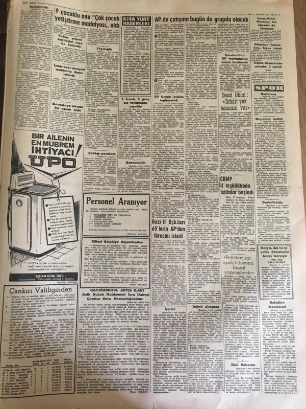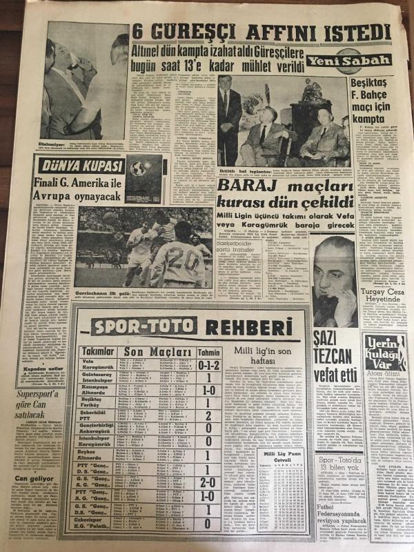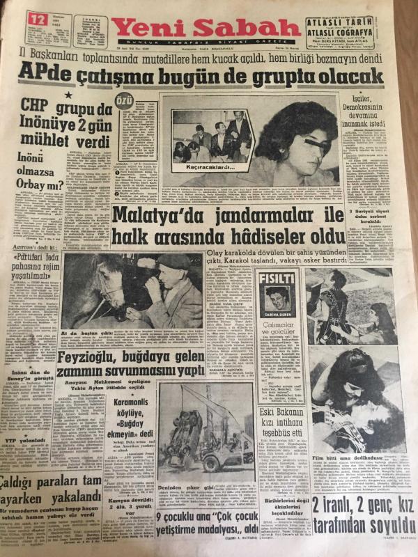 YENİ SABAH GAZETESİ 12 HAZİRAN 1962 YIL :25 SAYI :8349--AP de çatışma bugün de grupta olacak --CHP grubu da İnönü 'ye 2 gün mühlet verdi---Malatya da jandarmalar ile halk arasında hadiseler oldu ---Feyzioğlu , buğdaya gelen zammı savunmasını yaptı --Karamanlis köylüye buğday ekmeyin dedi ---Çaldığı paraları tam sayarken yakalandı --Eski Bakan Kızı İntihara Teşebbüs Etti ----9 Çocuklu ana çok çocuk yetiştirme madalyası aldı ---Kömür ile şeker :Siyavuşgil ---Sinemalar ,Radyolar --Atlas : Marsist ,Emek :Uçan Cambazlar ,İnci :Unutamadığım Kadın ,Konak :Aşk oyunları ,lale :Müthiş Mücadele ,Levent :Sevgili Hiroşima ---6 Güreşçi Affını İstedi --Finali G. Amerika ile Avrupa Oynayacak --Baraj maçları kurası dün çekildi --Beşiktaş Fenerbahçe Maçı İçin Kampa --Şazi Tezcan Vefat Etti -- Yıpranma, sararmalar, kupon kesiği ve yırtılmalar zamana bağlı olarak görülebilir.