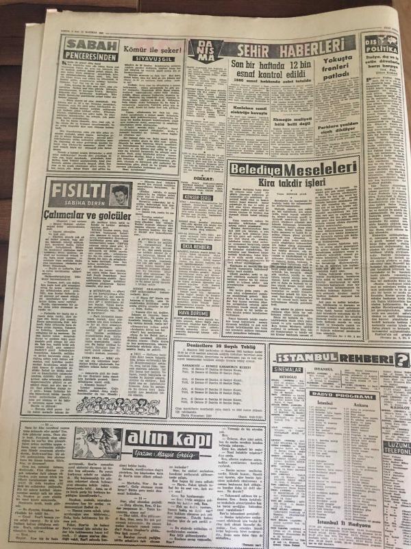 YENİ SABAH GAZETESİ 12 HAZİRAN 1962 YIL :25 SAYI :8349--AP de çatışma bugün de grupta olacak --CHP grubu da İnönü 'ye 2 gün mühlet verdi---Malatya da jandarmalar ile halk arasında hadiseler oldu ---Feyzioğlu , buğdaya gelen zammı savunmasını yaptı --Karamanlis köylüye buğday ekmeyin dedi ---Çaldığı paraları tam sayarken yakalandı --Eski Bakan Kızı İntihara Teşebbüs Etti ----9 Çocuklu ana çok çocuk yetiştirme madalyası aldı ---Kömür ile şeker :Siyavuşgil ---Sinemalar ,Radyolar --Atlas : Marsist ,Emek :Uçan Cambazlar ,İnci :Unutamadığım Kadın ,Konak :Aşk oyunları ,lale :Müthiş Mücadele ,Levent :Sevgili Hiroşima ---6 Güreşçi Affını İstedi --Finali G. Amerika ile Avrupa Oynayacak --Baraj maçları kurası dün çekildi --Beşiktaş Fenerbahçe Maçı İçin Kampa --Şazi Tezcan Vefat Etti -- adlı eser, Kitap > Süreli Yayınlar > Gazeteler > Türkiye > Genel > Günlük kategorisinde İkinci El olarak satıştadır.