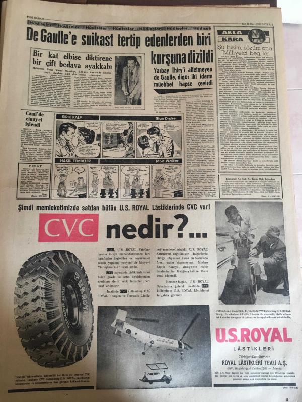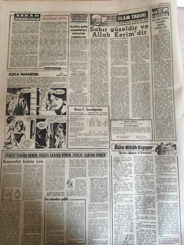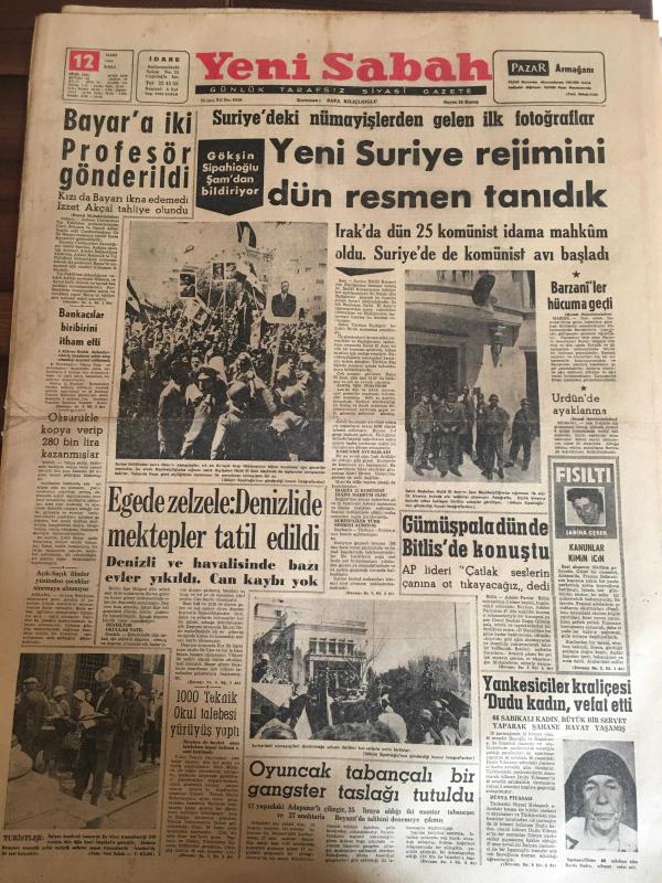YENİ SABAH GAZETESİ 12 MART 1963 YIL :25 SAYI :8620--Bayar a iki Profesör gönderildi --Yeni Suriye rejimini dün resmen tanıdık --Ege de zelzele : Denizli de mektepler tatil edildi --Barzaniler hücuma geçti --Gümüşpala dünde Bitlis de konuştu --1000 Teknik Okul Talebesi Yürüyüş Yaptı ---Yankesiciler kraliçesi Dudu kadın vefat etti ---Oyuncak tabancalı bir gangster taslağı tutuldu ---Karidesli Pilav : Siyavuşgil --Açıkta gıda maddeleri satanlar çoğalıyor ---De Gaulle e Suikast Tertip Edenlerden Biri Kurşuna Dizildi --Sinema Tiyatro --Yeni gelişen öncü tiyatroya yer var mı ?--Öğrencilerde kama ve tabanca bulundu ---Galatasaray Milano da --Ordu Takımımız dün Lüksemburg gitti --Genç Milliler yarın başkente Yunanistan ile karşılaşıyor ---Öksürükle kopya verip 280 bin lira kazanmışlar --Ürdün de ayaklanma ---Irak ta dün 25 komünist idama mahkum oldu .Suriye de de komünist avı başladı --- Yıpranma, sararmalar, kupon kesiği ve yırtılmalar zamana bağlı olarak görülebilir.