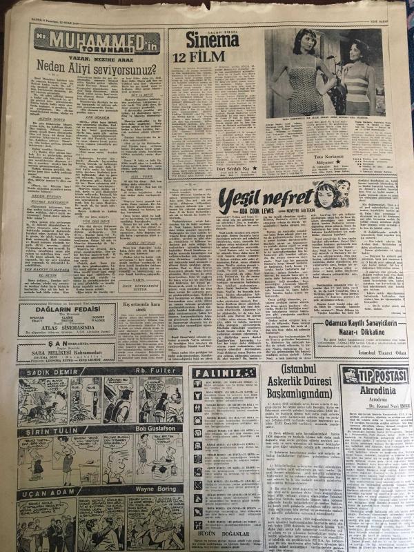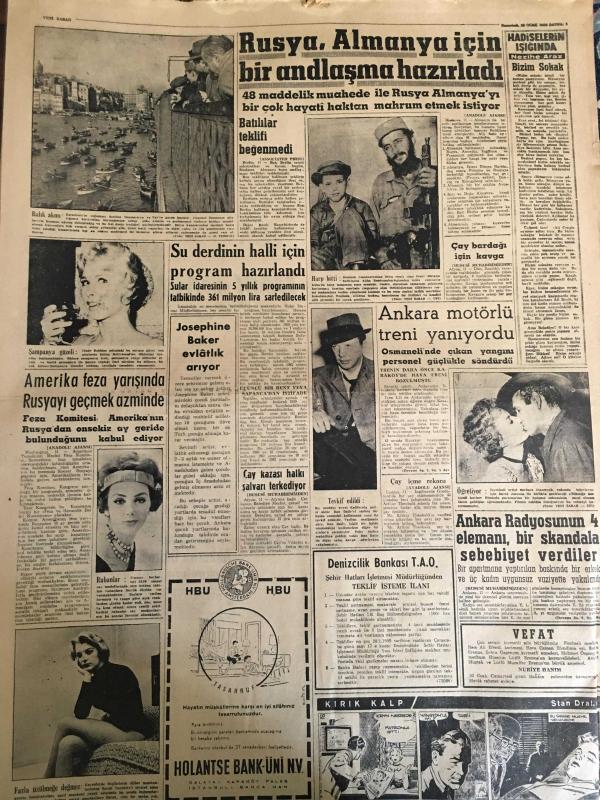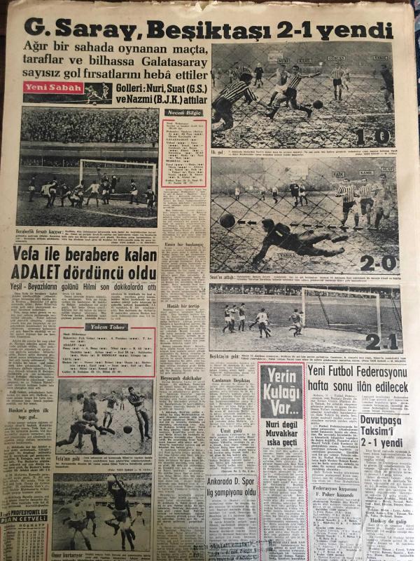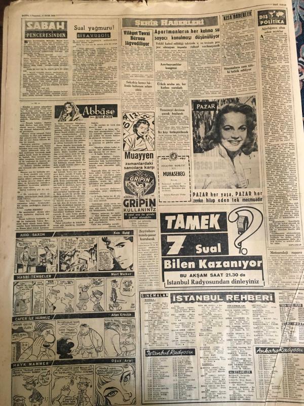 YENİ SABAH GAZETESİ 12 OCAK 1959 YIL :21 SAYI :7134--Öğretmen buhranı encümende tenkit edildi --CHP Kurultayı bugün toplanıyor ---İnfilak sahasında dün ceset bulunmadı --Balıkesir de Güçbirliğine katılanlar her gün artıyor --Çekmece yolundaki bir kaza da iki genç kız öldü --Silivri de hamile bir kadın ebenin ihmaline kurban gitti ---Şiddetli yağmur Balıkesir de hasar yaptı ---Sual yağmuru :Siyavuşgil---Rusya ,Almanya için bir antlaşma hazırlandı --Su derdinin halli için program hazırlandı --Amerika feza yarışında Rusya yı geçmek azminde --Ankara motorlü treni yanıyordu ---Ankara Radyosunun 4 elemanı ,bir skandala sebebiyet verdiler ---Sinema : Dört sevdalı kız ,Toto korkusuz milyoner ,---Bir karı koca metroda birbirlerini kaybettiler ---Galatasaray ,Beşiktaş ı 2-1 yendi --Vefa ile berabere kalan adalet dördüncü oldu --Yeni futbol federasyonu hafta sonu ilan edilecek ---Kıbrıs Türklerini kalkındırmak için tedbirler ---İngiliz hostesleri kısa etek istemiyor --- Yıpranma, sararmalar, kupon kesiği ve yırtılmalar zamana bağlı olarak görülebilir.