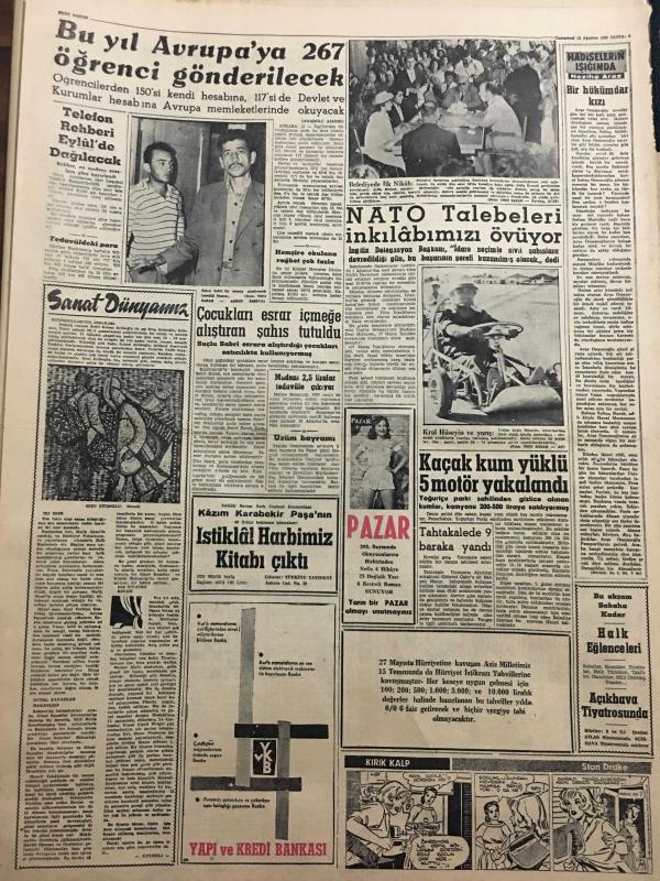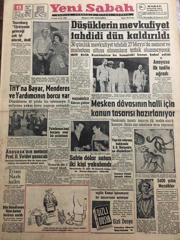 YENİ SABAH GAZETESİ 13 AĞUSTOS 1960 YIL :23 SAYI :7694--Thornburg Türkiye nin geleceği çok iyi olacak dedi --Düşüklerin mevkufiyet tahdidi dün kaldırıldı --TYH na Bayar Menderes ve Yardımcının Borcu Var---Madanoğlu Kıbrıs a gidiyor --Mesken davasının halli için kanun tasarısı hazırlanıyor ---Anayasa nın metnini Prof .H.Veldet yazacak ---Sahte dolar satan iki kişi yakalandı --Toprak reformu hakkında Ş.R Hatipoğlu ne düşünüyor ?--2400 yıllık mozaikler --Tekke ağzı :Siyavuşgil --Sinemalar :Alkazar :İntikam Tuzağı ,Atlas :Müşvik Kuvvet ,Çınar :Son Beste ---Bu yıl Avrupa ya 267 öğrenci gönderilecek --NATO talebeleri inkılabımızı övüyor--Çocukları esrar içmeğe alıştıran şahıs tutuldu --Kaçak kum yüklü 5 motör yakalandı --Sinema :Mükafatlardan mahrum kalan Türk sineması --Beşiktaş bugün Ankara da oynuyor --Bazı Milli lig maçları Fenerbahçe oynayacak --İstanbul -Ankara Atletizm Müsabakası --Teniste Lübnan la karşılaşıyoruz --Hintli atlet Sing Seye i mağlup etti --- Yıpranma, sararmalar, kupon kesiği ve yırtılmalar zamana bağlı olarak görülebilir.
