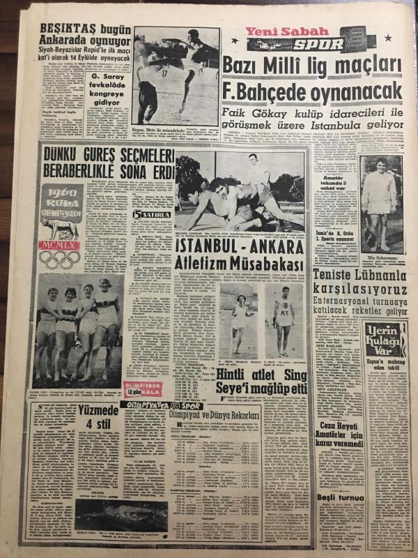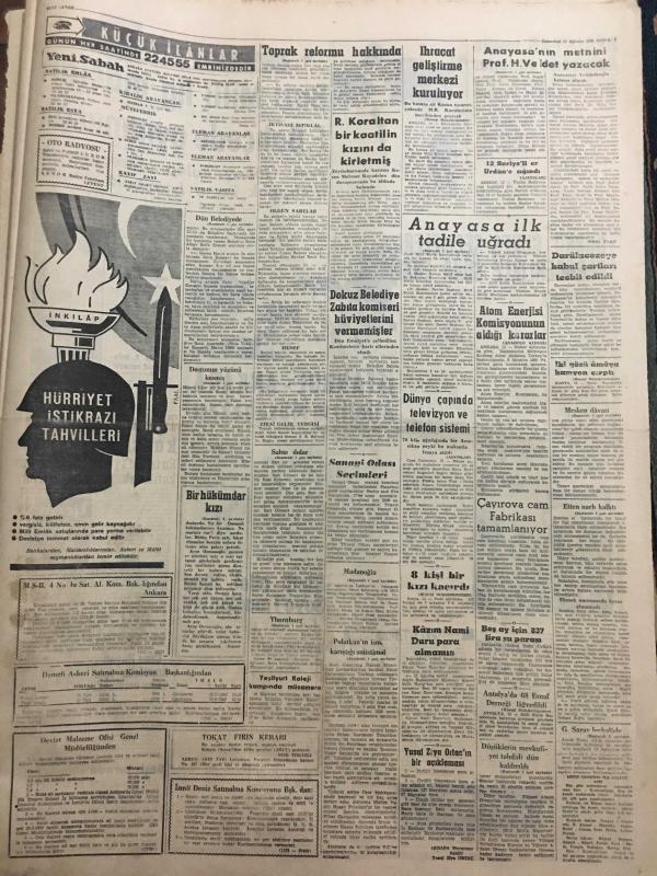 YENİ SABAH GAZETESİ 13 AĞUSTOS 1960 YIL :23 SAYI :7694--Thornburg Türkiye nin geleceği çok iyi olacak dedi --Düşüklerin mevkufiyet tahdidi dün kaldırıldı --TYH na Bayar Menderes ve Yardımcının Borcu Var---Madanoğlu Kıbrıs a gidiyor --Mesken davasının halli için kanun tasarısı hazırlanıyor ---Anayasa nın metnini Prof .H.Veldet yazacak ---Sahte dolar satan iki kişi yakalandı --Toprak reformu hakkında Ş.R Hatipoğlu ne düşünüyor ?--2400 yıllık mozaikler --Tekke ağzı :Siyavuşgil --Sinemalar :Alkazar :İntikam Tuzağı ,Atlas :Müşvik Kuvvet ,Çınar :Son Beste ---Bu yıl Avrupa ya 267 öğrenci gönderilecek --NATO talebeleri inkılabımızı övüyor--Çocukları esrar içmeğe alıştıran şahıs tutuldu --Kaçak kum yüklü 5 motör yakalandı --Sinema :Mükafatlardan mahrum kalan Türk sineması --Beşiktaş bugün Ankara da oynuyor --Bazı Milli lig maçları Fenerbahçe oynayacak --İstanbul -Ankara Atletizm Müsabakası --Teniste Lübnan la karşılaşıyoruz --Hintli atlet Sing Seye i mağlup etti ---, SAFA KILIÇLIOĞLU tarafından kaleme alınmıştır. Kitap 1960 yılında [YENİ SABAH MATBAA] o ISBN kodu ile yayınlanmıştır. 6 sayfadır. YENİ SABAH GAZETESİ 13 AĞUSTOS 1960 YIL :23 SAYI :7694--Thornburg Türkiye nin geleceği çok iyi olacak dedi --Düşüklerin mevkufiyet tahdidi dün kaldırıldı --TYH na Bayar Menderes ve Yardımcının Borcu Var---Madanoğlu Kıbrıs a gidiyor --Mesken davasının halli için kanun tasarısı hazırlanıyor ---Anayasa nın metnini Prof .H.Veldet yazacak ---Sahte dolar satan iki kişi yakalandı --Toprak reformu hakkında Ş.R Hatipoğlu ne düşünüyor ?--2400 yıllık mozaikler --Tekke ağzı :Siyavuşgil --Sinemalar :Alkazar :İntikam Tuzağı ,Atlas :Müşvik Kuvvet ,Çınar :Son Beste ---Bu yıl Avrupa ya 267 öğrenci gönderilecek --NATO talebeleri inkılabımızı övüyor--Çocukları esrar içmeğe alıştıran şahıs tutuldu --Kaçak kum yüklü 5 motör yakalandı --Sinema :Mükafatlardan mahrum kalan Türk sineması --Beşiktaş bugün Ankara da oynuyor --Bazı Milli lig maçları Fenerbahçe oynayacak --İstanbul -Ankara Atletizm Müsabakası --Teniste Lübnan la karşılaşıyoruz --Hintli atlet Sing Seye i mağlup etti --- adlı eser Türkçe dilindedir.