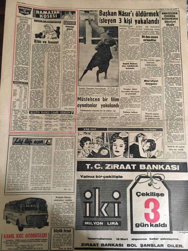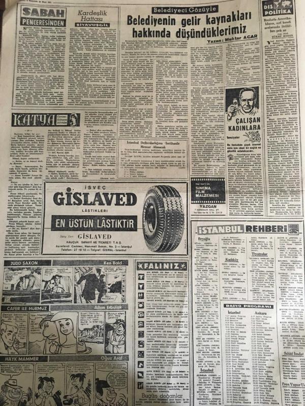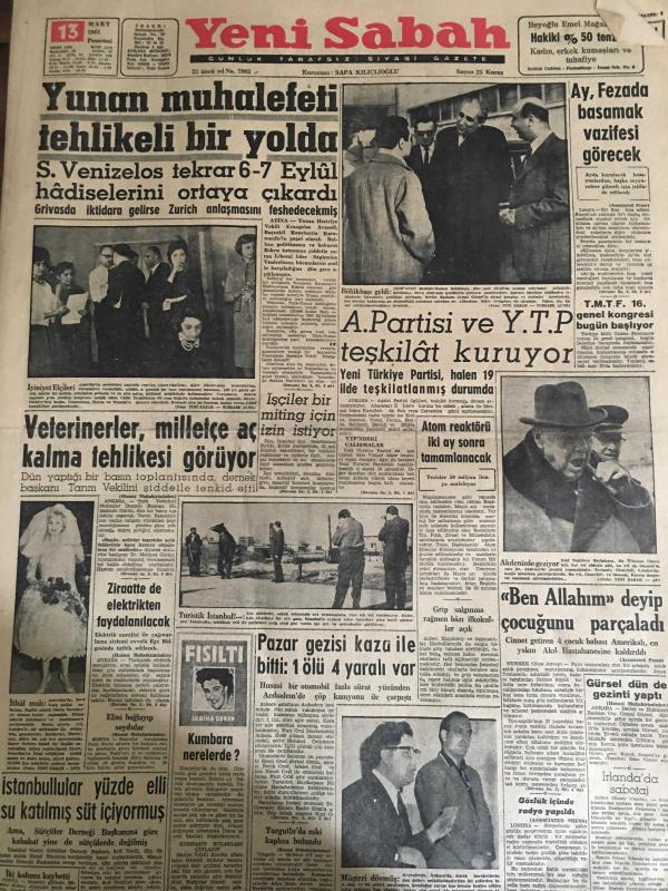 YENİ SABAH GAZETESİ 13 MART 1961 YIL :23 SAYI :7903--Yunan Muhalefeti Tehlikeli Bir Yolda ---Veterinerler ,milletçe aç kalma tehlikesi görüyor --Ay ,fezada basamak vazifesi görecek --A.Partisi ve YTP Teşkilat Kuruyor ---Ziraatte de elektrikten faydalanılacak ---Pazar gezisi kaza ile bitti :1 ölü 4 yaralı var --Ben Allah ım deyip çocuğunu parçaladı ---İstanbullular yüzde elli su katılmış süt içiyormuş ---Kardeşlik Hattası :Siyavuşgil ---Belediyenin gelir kaynakları hakkında düşündüklerimiz ---Radyo Programları ---Başkan Nasır ı öldürmek isteyen 3 kişi yakalandı --Müstehcen bir filim oynatanlar yakalandı ---Gece bekçisi polise yanlış bilgi verdi --Belçika da kadın ticaret yapan bir çete yakalandı --İtalya da Avukatlar Grev Yaptı ---Galatasaray penaltı golü ile kazandı :1-0--Elle atılan gol Vefa ya iki puan kazandırdı :1-0---Karşıyaka ,Altınordu ile 3-3 berabere kaldı ---Milli Takım için Alman antrenör --G.Birliği Şeker Hilali Güç Mağlup Etti :1-0--İşçiler bir miting için izin istiyor - Yıpranma, sararmalar, kupon kesiği ve yırtılmalar zamana bağlı olarak görülebilir.
