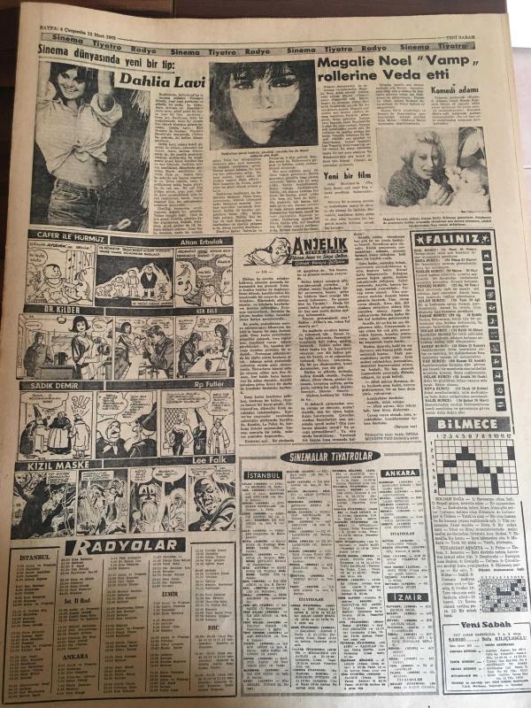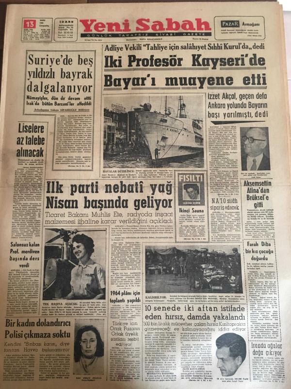 YENİ SABAH GAZETESİ 13 MART 1963 YIL :25 SAYI :8621---Suriye de beş yıldızlı bayrak dalgalanıyor --Liselere az talebe alınacak --İlk parti nebati yağ nisan başında geliyor --İki profesör Kayseri de Bayar ı muayene etti --Salonsuz kalan Prof merdiven başında ders verdi --Bir kadın dolandırıcı polis çıkmaza soktu ---Akşemsettin Atina dan Brüksel gitti --Farh Diba bir kız çocuğu doğurdu --1964 planı için toplantı yapıldı --10 sene de iki aftan istifade eden hırsız ,damda yakalandı --Türkiye için ortak pazarın ortak üyelik şartları tespit ediliyor ---Eğer bu idiyse : Siyavuşgil --Nükleer harp te ilk safhada 300 milyon insan ölecek --Adapazarı n da üç kalpazan ele geçti ---Portekiz 'e yeşil yağmur yağdı --Van ilinde yem darlığı başladı --Boston da 9 kadın öldürüldü ---Evlat katili 15 yıl hapis cezası yedi --Sinema dünyasında yeni bir tip : Dahlia Lavi --Magalie Noel Vamp Rollerine Veda Etti---Galatasaray -Milan --Türk -Yunan Genç Milli Maçı Bugün Ankara da Oynanıyor -- Yıpranma, sararmalar, kupon kesiği ve yırtılmalar zamana bağlı olarak görülebilir.
