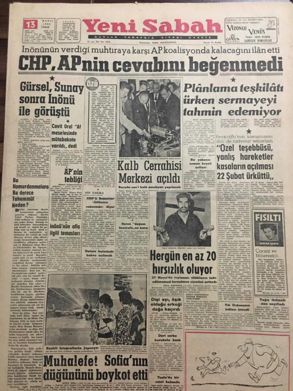 YENİ SABAH GAZETESİ 13 MAYIS YIL :25 SAYI :8322--CHP ,AP nin cevabını beğenmedi --Gürsel ,Sunay sonra İnönü ile görüştü ---Planlama teşkilatı ürken sermayeyi tahmin edemiyor ---Kalp Cerrahisi Merkezi Açıldı --Özel teşebbüsü yanlış hareketler kasaların açılması 22 Şubat ürküttü ---Her gün en az 20 hırsızlık oluyor --Muhalefet Sofia nın düğününü boykot etti --Küçük icadlar : Siyavuşgil ---Radyo Programları ---Kocam R.Burton ve Liz Taylor --Rock ve Twist Rusya da yasak ---Dış olaylar : İspanya da gösteri yapan öğrenciler tevkif edildi ---Bengal de 13 Müslüman Öldürülmüş ---Hediye alan Bakan Yardımcısı istifa etti ---Beşiktaş ,Iz.Spor dan Güç Kurtuldu --0-0---İsrail takımı bugün geliyor --Vefa dün iddialı Altay ı 1-0 yendi ---G.Birliği ,baraj yolcusu D.Spora şans tanımadı --Y.Direk tek puanı bile güç aldı ---Karşıyaka :3 Karagümrük :2 ---İ.Spor :0-A.Gücü :0--Cavit Oral : Af meselesinde mütabakata varıldı dedi --- Yıpranma, sararmalar, kupon kesiği ve yırtılmalar zamana bağlı olarak görülebilir.