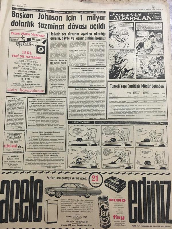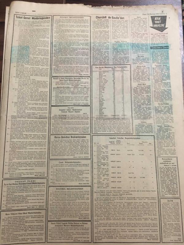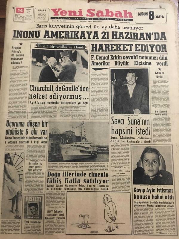 YENİ SABAH GAZETESİ 14 HAZİRAN 1964 YIL :27 SAYI :9070--İnönü Amerika ya 21 Haziran da Hareket Ediyor --Churchill de Gaulle den nefret ediyormuş --Uçuruma düşen bir otobüste 6 ölü var ---Savcı Suna nın hapsinin istedi ---Doğu illerinde çimento fahiş fiyatla satılıyor ---Kayıp Ayla istismar konusu halini aldı --Araplar Kıbrıs a ne zaman müdahale edecek ?--Başkan Johnson için 1 milyar dolarlık tazminat davası açıldı ---Beşiktaş-Altay bugün oynuyor --Galatasaray finale kaldı --Fenerbahçe ,PTT li Şükrü ye 40.000 lira teklif etti ----Başpehlivanlar içinde en iddialısı Kara Ali --38. Gazi Koşusu Bugün Koşuluyor ---Güzelliği Sevda Ferdağ ın başını yine derde soktu --Başarılı bir rejisör senarist ve oyuncu :Süha Doğan --Gülçin Kutlu :Paramparça oyununda ---Galatasaray yeni sezon büyük hamle yapacak --Yeryüzünde her gün 100 kişiden biri futbolcu --- Yıpranma, sararmalar, kupon kesiği ve yırtılmalar zamana bağlı olarak görülebilir.