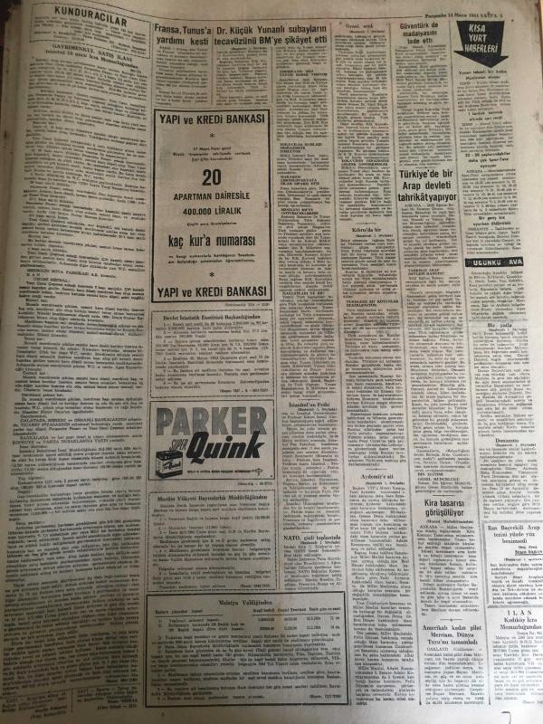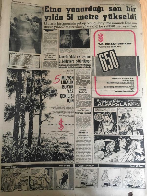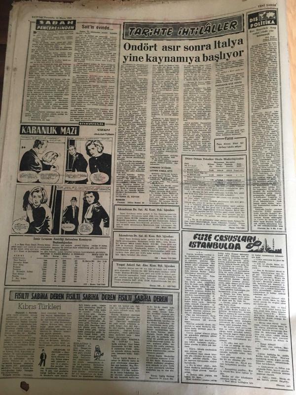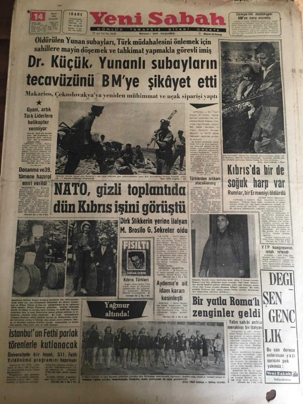 YENİ SABAH GAZETESİ 14 MAYIS 1964 YIL :27 SAYI :9039---Dr.Küçük Yunanlı Subayların Tecavüzünü BM ye Şikayet Etti --Gyani, artık Türk liderlere helikopter vermiyor ---NATO ,gizli toplantıda dün Kıbrıs işini görüştü---- Kıbrıs da bir de soğuk harp var ---İstanbul un Fethi parlak törenlerle kutlanacak ---Bir yatla Romalı zenginler geldi ----Sait 'in evinde : Siyavuşgil ---Sinemalar ,Radyo Programcılığı ,Tiyatrolar ---Etna yanardağı son bir yılda 51 metre yükseldi --Amerika da ırk ayrımı B. Milletlere götürülüyor ---5 Milyon Liralık Büyük Yaz Çekilişi İçin : İş Bankası --Fransa ,Tunus a yardımı kesti ----Ümitler ,İstanbul spor ile berabere kaldı : 1-1 ---PTT şike iddiasını reddetti ----Galatasaray da 6 futbolcu bu yıl serbest kalıyor --Fenerbahçe ,Lefter in kontratını feshetmedi ---Real Madrid ,final için doping kontrolü istiyor ---Beykoz bütün ümidini Ankara maçına bağladı ---Ordulararası futbol finali Türkiye de Yapılacak----- Yıpranma, sararmalar, kupon kesiği ve yırtılmalar zamana bağlı olarak görülebilir.