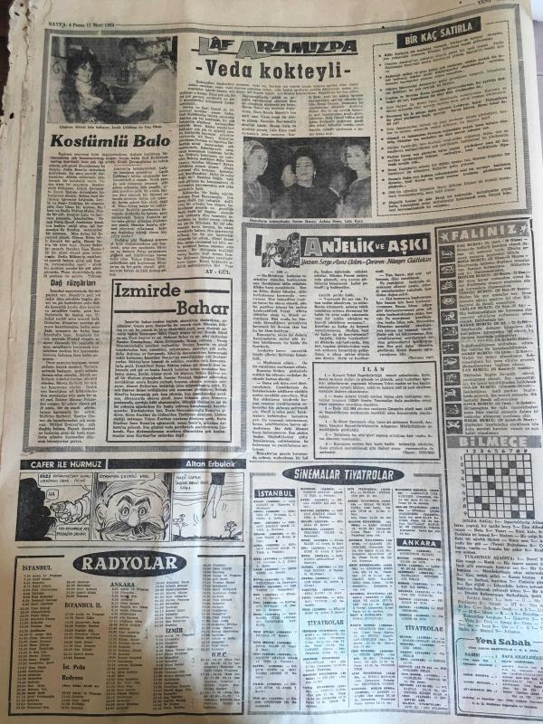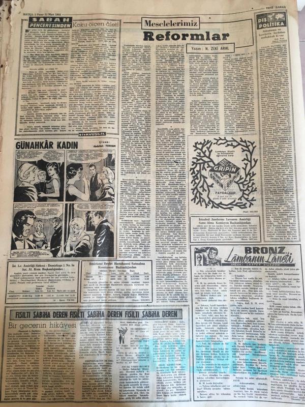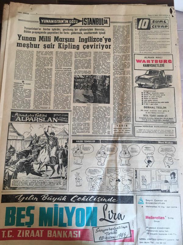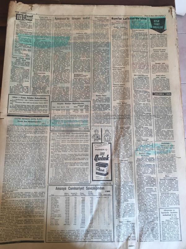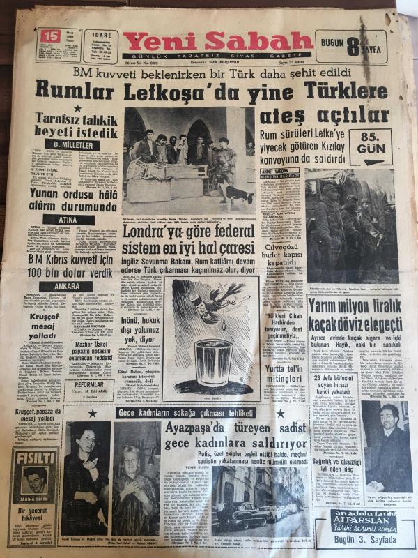 YENİ SABAH GAZETESİ 15 MART 1964 YIL :26 SAYI :8982--Rumlar Lefkoşa da yine Türklere ateş açtılar ---Yunan ordusu hala alarm durumunda --BM Kıbrıs kuvveti için 100 bin dolar verdik ---Londra ya göre federal sistem en iyi hal çaresi --İnönü hukuk dışı yolumuz yok diyor ---Yarım milyon liralık kaçak döviz ele geçti ---Ayazpaşa da türeyen sadist gece kadınlara saldırıyor ---Koku ölçen alet : Siyavuşgil ---Yunan Milli Marşını İngilizce ye meşhur şair Kipling çeviriyor ----Fenerbahçe imtihanı veremedi :1-2--K.Paşa ,A.Gücünden bir puan aldı :0-0---İst.Spor ,G.Birliği ile berabere :2-2--Vefa :1 Sarıyer :0--Fenerbahçe ,Galatasaray ile karşılaşıyor --Altay :2 Feriköy :0---Sinema Nilüfer Aydan ın aklının köşesinde bile geçmiyormuş --Sinema Tiyatro :Jönlerimiz birer kuklaya benziyor - - Türk Müziği ciddi olarak icra edeceğiz ---Buca Cezaevinde Hamlet Seyrettik --Zeki Müren Opera da ---Basri :Biz topu yerdik de golü yemezdik diyor --Arkadaşları tarafından sevilmeyen futbolcular -- Yıpranma, sararmalar, kupon kesiği ve yırtılmalar zamana bağlı olarak görülebilir.