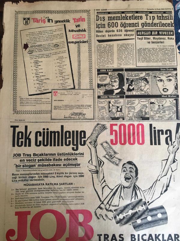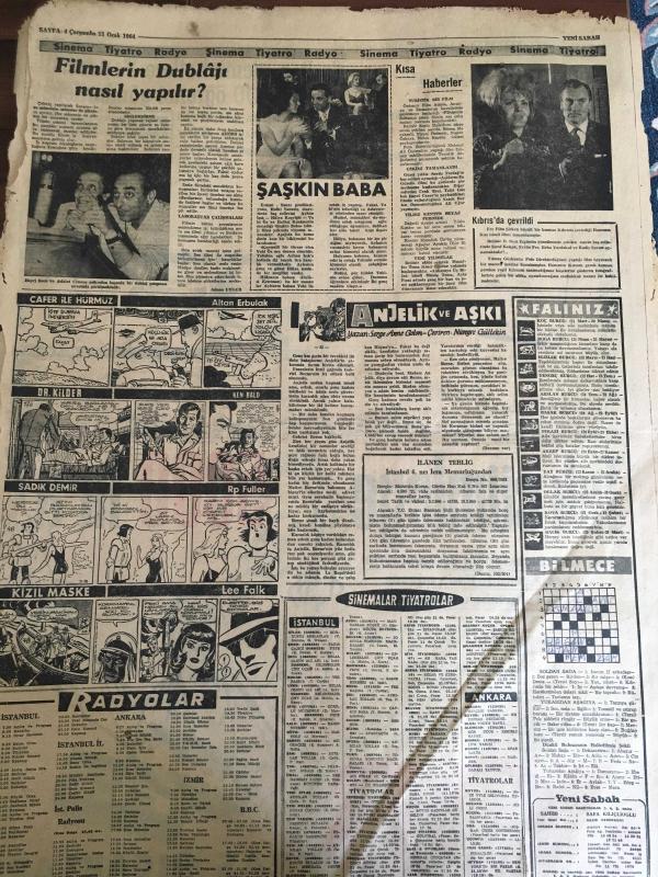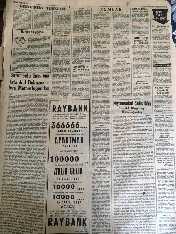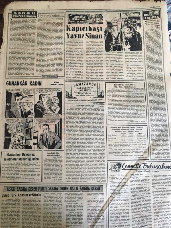 YENİ SABAH GAZETESİ 15 OCAK 1964 YIL :26 SAYI :8924---Ölü Kıbrıs Cumhuriyetini İngiltere Diriltmek İstiyor --Rumlar ,yeniden barikat kuruyor --Girne de ki Türkler Rumları sindirmiş --Ramazanın ilk günü şehitler anılacak ---Bengal karışıklıklarında en az 200 kişi can verdi ---Üçüncü reform :Siyavuşgil ---Dış memleketlere tıp tahsili için 600 öğrenci gönderilecek --Sinema :Şaşkın Baba --Güven olayı tahkikatı 4 yönden yürütülüyor --Fenerbahçelilerden dün 250 şer lira ceza kesildi --PTT ,K.Gümrük ü kupadan eledi :1-0--Yaşar Doğu nun bütün eşyalarına haciz kondu --Sarper ,Suçlu EOKA Kıbrıs a hakim dedi ---Atom bombası yüklü uçak düşüt fakat bombalar patlamadı --Kıbrıs mevzuunda taraflar bugün Londra da pazarlığa oturacak --Ramazan Köşesinde :İslam dan Önceki Dünya ---Rossides in son dakika da oyun bozanlık etmesi ile B.M Müşahit göndermiyor ---Yarın Ramazan --- Yıpranma, sararmalar, kupon kesiği ve yırtılmalar zamana bağlı olarak görülebilir.