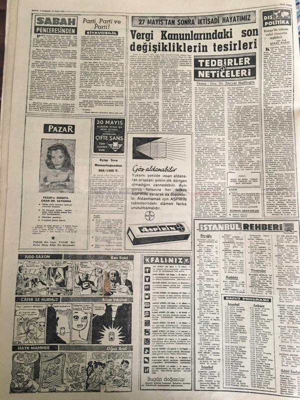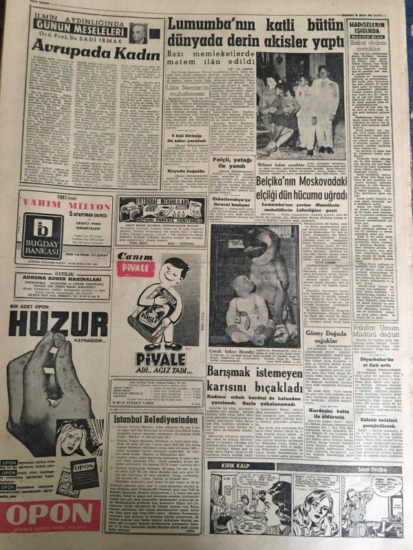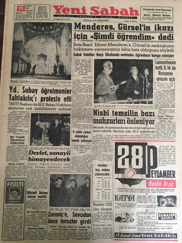 YENİ SABAH GAZETESİ 15 ŞUBAT 1961 YIL :23 SAYI :7877---Menderes ,Gürsel in ikazı için şimdi öğrendim dedi --Yd.Subay öğretmenler Tahtakılıç ı protesto etti --5 Yıldır çeteci olmadığını ispata çalışıyor --Müstafi Dekan tekrar seçildi --Zoraniç e Savcıdan Önce Hırsızlar Girdi --Burslar 250 lira oluyor --Lumumbanın katli ,BM ile Rusya nın arasını açtı ---Parti ,Parti ve Parti ! :Siyavuşgil --Vergi Kanunlarındaki Son Değişikliklerin Tesirleri ---Radyo Programları ---Lumumba nın katli bütün dünya da derin akisler yaptı --Belçika nın Moskova da ki elçiliği dün hücuma uğradı ---Barışmak istemeyen karısını bıçakladı --Tiyatro : Keçiler Korosundaki Başarının Neticesi :Kamuran Özbir --Nisbi temsilin bazı mahzurları önleniyor ---Galatasaray bugün İsrail Milli Takımı ile oynuyor ---Belediye rüsumu yüzde 20 ye indi ---Kadıköy ve İstanbul grupları arasındaki gerginlik artıyor ---Şura ,dün Spor Akademisi kurulmasını kabul etti --İstanbul a 500 bin spor toto kuponu gönderilecek --- Yıpranma, sararmalar, kupon kesiği ve yırtılmalar zamana bağlı olarak görülebilir.