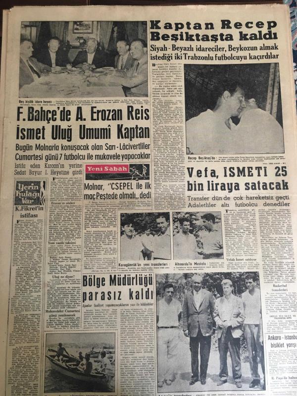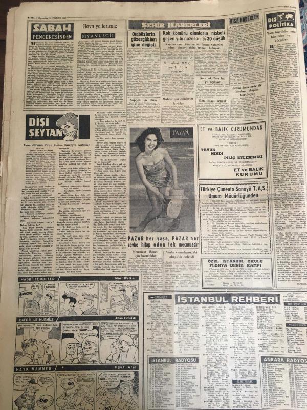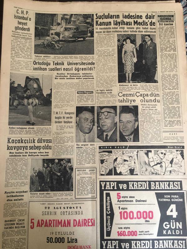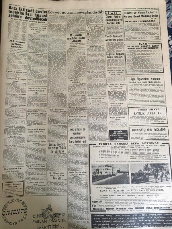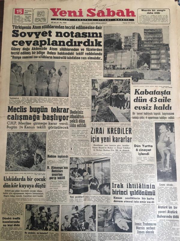YENİ SABAH GAZETESİ 15 TEMMUZ 1959 YIL :22 SAYI :7313-- Türkiye nin Atom silahlarından tecrid edilmesine dair :Sovyet notasını cevaplandırdık---Meclis bugün tekrar çalışmağa başlıyor --Kabataş ta dün 43 aile evsiz kaldı --Üsküdar da bir çocuk dün kör kuyuya düştü --Zirai krediler için yeni kararlar ---Irak ihtilalin birinci yıldönümü --Atatürk ün bir yaveri Atatürk Bulvarında öldü --Dün yurtta 6 cinayet işlendi ---Hava yollarımız :Siyavuşgil --İstanbul Rehberi ---CHP İstanbul a heyet gönderdi ---Suçların iadesine dair kanun layihası Meclis de --Ortadoğu Teknik Üniversitesin de suallerle nasıl öğrenildi ?--Cezmi Çapa dün tahliye olundu ---Kaçakçılık davası kavgaya sebep oldu ---Kaptan Recep Beşiktaş ta kaldı --Fenerbahçe de A. Erozan Reis İsmet Uluğ Umumi Kaptan ---Vefa ,İsmet i 25 bin liraya satacak --Bölge Müdürlüğü Parasız Kaldı ---Bedelsiz ithalatın şekli dün ilan edildi --Dünkü trafik kazalarında üç kişi öldü ---Dün yurtta 6 cinayet işlendi --- Yıpranma, sararmalar, kupon kesiği ve yırtılmalar zamana bağlı olarak görülebilir.