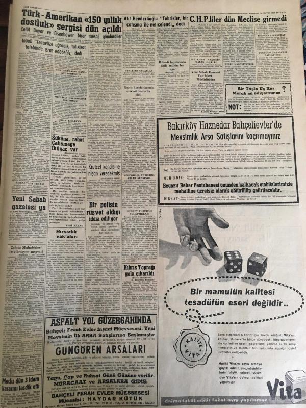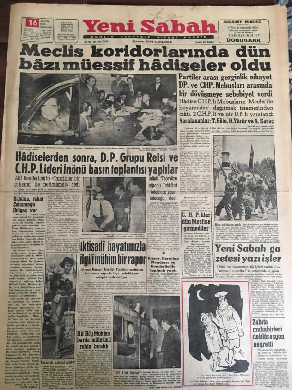 YENİ SABAH GAZETESİ 16 MAYIS 1959 YIL :22 SAYI :7256--Meclis koridorlarında dün bazı müessif hadiseler oldu ---Hadiselerden sonra ,D.D Grubu Reisi ve CHP lideri İnönü basın toplantısı yaptılar --İktisadi hayatımızla ilgili mühim bir rapor --CHP liler dün Meclise giremediler --Zabıta muhabirleri deklarasyon neşretti ---Polisle Gazeteci :Siyavuşgil --İstanbul Rehberi --Batılılar Berlin in bir seçimle birleştirilmesini teklif ettiler ---Akyazı da iki kişiyi vuran Albay da öldü --Sinema :Cinayet Dalgası ,Kadınlar Kalesi ,Kalpazanlar Mücadelesi ---Türk -Amerikan 150 yıllık dostluk sergisi dün açıldı --Galatasaray liderlik şansını K.Gümrük karşısında deniyor ---Güreş birincilikleri arzu edilen alakayı toplamadı --Federasyon Kupasında Eyüp ,B.Spor ,F.Köy Galip ---Milli Namzetler Galatasaray yendi ---Fenerbahçe de yarın Niyazi ve Ozcan yok -- Yıpranma, sararmalar, kupon kesiği ve yırtılmalar zamana bağlı olarak görülebilir.