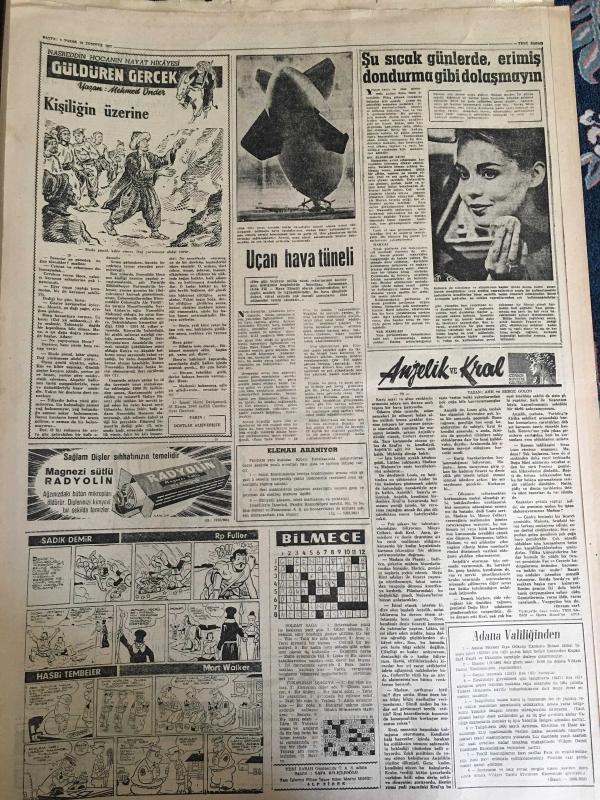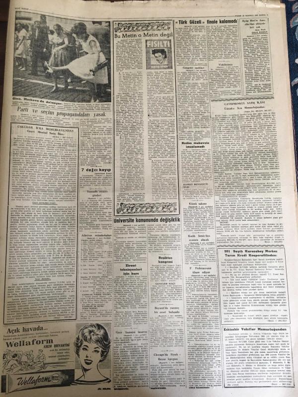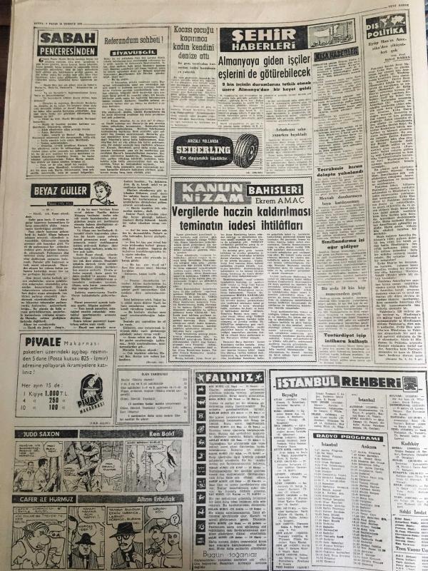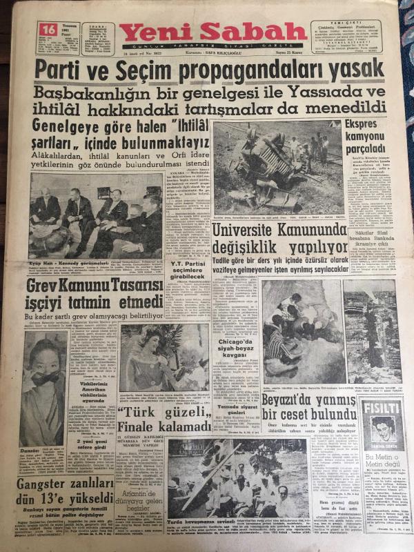 YENİ SABAH GAZETESİ 16 TEMMUZ 1961 YIL :24 SAYI :8023--Parti ve Seçim Propagandaları Yasak: Genelgeye göre halen ihtilal şartları içinde bulunmaktayız ---Grev Kanunu Tasarısı İşçiyi Tatmin Etmedi --Ekspres kamyonu parçaladı --Üniversite Kanununda Değişiklik Yapılıyor ---Türk güzeli finale kalamadı --Gangster zanlıları dün 13 e yükseldi ---Beyazıt da yanmış bir ceset bulundu ---Referandum Sohbeti :Siyavuşgil --Almanya ya giden işçiler eşlerini de götürebilecek ---Radyo Programları ---E.Taylor Moskova da imza meraklılarının hücumuna uğradı ---Kırkpınar da I.Karabacak Ali Yağcı ile güreş tutmadı ---Basrı de kulübü ile mukavele imzaladı ---Atletizm müsabakalarında ilk gün :Amerika 64 -Rusya 54 ---Kutik İzmir den 3 Oyuncu Alacak --Kürek takımı teknesiz kaldı --F.Federasyonu istişare heyetini itham ediyor --Arjantin de dünyaya gelen beşizler --Chicago da siyah -beyaz kavgası --YT Partisi seçimlere girebilecek -- Yıpranma, sararmalar, kupon kesiği ve yırtılmalar zamana bağlı olarak görülebilir.