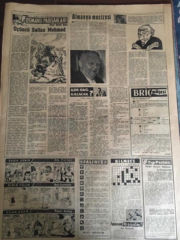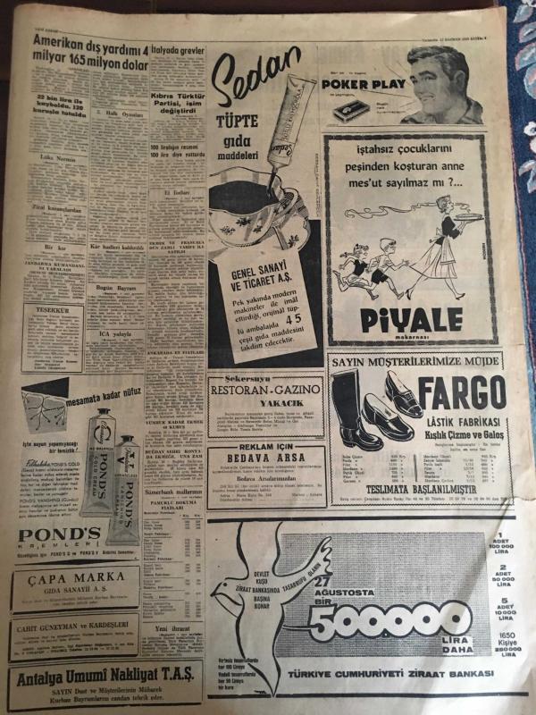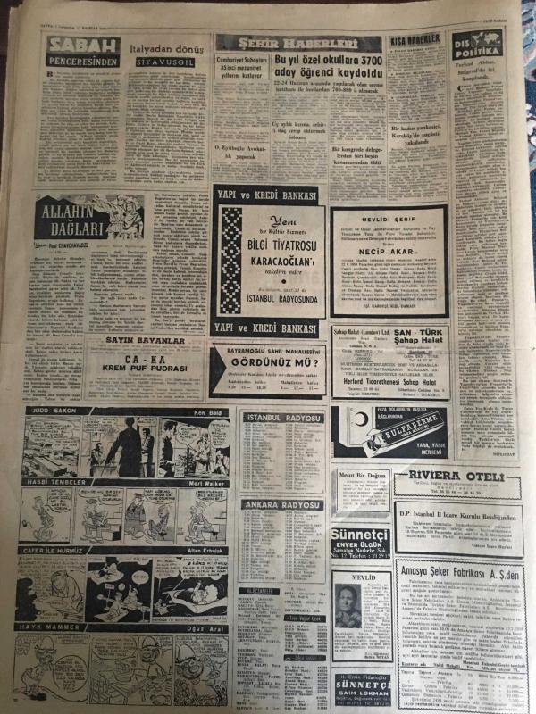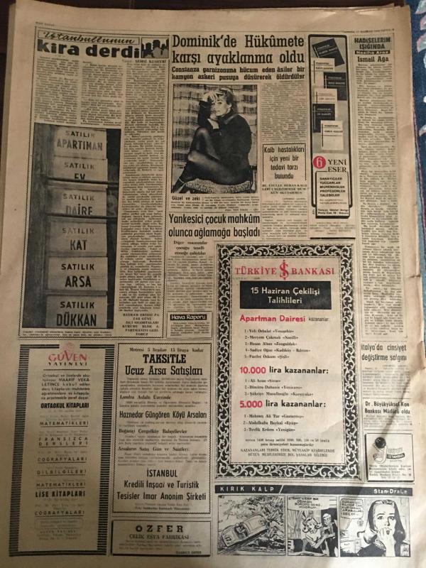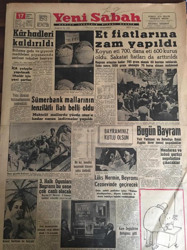 YENİ SABAH GAZETESİ 17 HAZİRAN 1959 YIL :22 SAYI :7288---Kar hadleri kaldırıldı ---Et Fiyatlarına Zam Yapıldı --Sümerbank mallarının tenzilatlı fiyatı belli oldu ---Bugün Bayram --3. Halk Oyunları Bayramı bu sene çok canlı olacak --Lüks Nermin ,Bayramı Cezaevinde Geçirecek ---İCA yoluyla yapılacak ithalat için yeni şartlar ---İtalya dan dönüş ---Radyo Programları ---Dominik de Hükümete Ayaklanma Oldu --Yankesici çocuk mahkum olunca ağlamaya başladı ---Amerikan dış yardımı 4 milyar 165 milyon dolar ---Galatasaray Ahmet için Beşiktaş a müracaat etti --Profesyonel futbolcular gelecek sene transfer edemeyecekler --B Milli Takımı dün ilk idmanını yaptı ---Amatör Milli Takım Hazırlıkları Başladı --Bir kız kendisini kaçırmak isteyen şahsı öldürdü ---Yeni ihracat talimatnamesi neşredildi --Kore Değiştirme Birliğimiz Gitti -- Yıpranma, sararmalar, kupon kesiği ve yırtılmalar zamana bağlı olarak görülebilir.