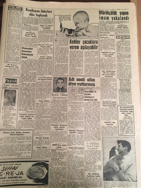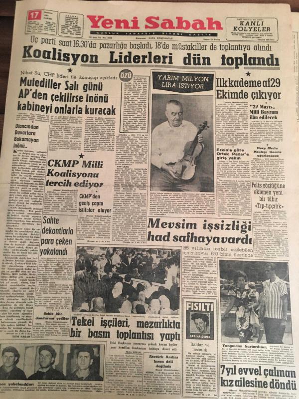 YENİ SABAH GAZETESİ 17 HAZİRAN 1962 YIL :25 SAYI :8354--Koalisyon liderleri dün toplandı --CKMP Milli Koalisyonu Tercih Ediyor --Mevsim işsizliği had safhaya vardı --Tekel işçileri mezarlıkta bir basın toplantısı yaptı --Sahte dekontlarla para çeken yakalandı --İlk kademe af 29 Ekimde çıkıyor --Muhalif Hasbi Bey :Siyavuşgil --Sinemalar :Marsist ,Emek :Gizli Münasebetler ,İnci Satın Alınan Adam ,Konak :Aşk Oyunları ,Saray :Kahraman Kardeşler --De Gaulle 'e yeni bir suikast teşebbüsü --Sovyet gizli casus okulunda öğrenim müddeti on iki sene ---Vefa Baraj 'a Düştü --Galatasaray Şampiyon --Güreş kafilesi bu akşam gidiyor ----Napoli Can 'ı almak istiyor -- Yıpranma, sararmalar, kupon kesiği ve yırtılmalar zamana bağlı olarak görülebilir.