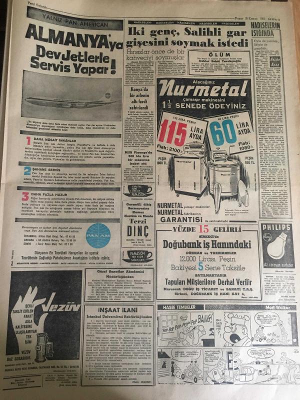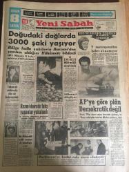 YENİ SABAH GAZETESİ 18 KASIM 1962 YIL :25 SAYI :8508---Doğudaki dağlarda 3000 şaki yaşıyor ---Tabancalı mühendis dün de bulunamadı ---Eminsu MDO ve SDK aleyhinde ---Resmi dairede fuhuş yapanlar yakalandı ---AP 'ye göre plan demokratik değil ---Küfür Oyunu : Siyavuşgil ---85 bin liralık tebligat yolsuzluğu ile ilgili 2 kişi daha tevkif edildi ---Sinemalar :Atlas :Maceralar Yolunda ,İnci : Çam Sakızı ,Konak :Casuslar Çarpışıyor ---İki genç ,Salihli gar gişesini soymak istedi ---Galatasaray -Bytom --Bu gece Yugoslavya ile finali oynuyoruz ---K.Paşa :1 İz.Spor :0---Vefa 'nın yeni tertibi A.Ordu ile yenişemedi ---Sürpriz :K.Yaka D.Sporu 1-0 yendi ---- Sinema Tiyatro :Artık Yerli Film Kompleksinden Kurtulmalıyız ---Mylene Demongeot ---Tijen Par 'a dikkat ediniz --- Belgin Doruk ,Göksel Arsoy : Ayımasalı ,Çikolata ,Sevgilim ,Çalı Kuşu ---Uğur Başaran :Sahneye ablası hastalanınca apar topar çıktı ---Hayat Bazen Tatlıdır :Zeki Müren ,Belgin Doruk , Suna Pekuysal -- Yıpranma, sararmalar, kupon kesiği ve yırtılmalar zamana bağlı olarak görülebilir.