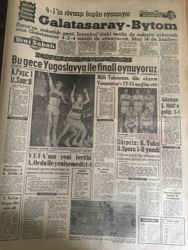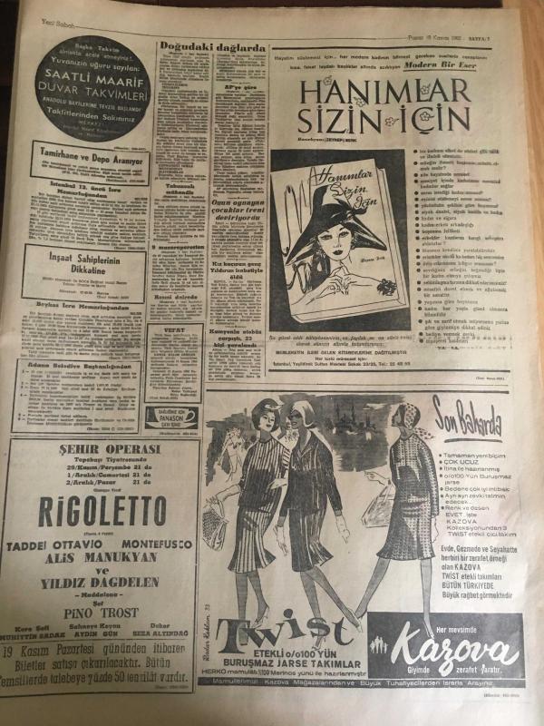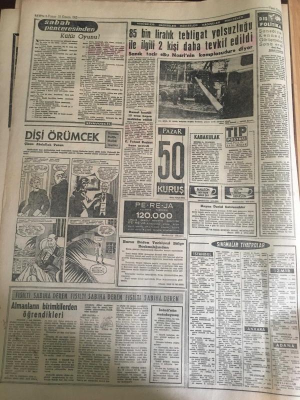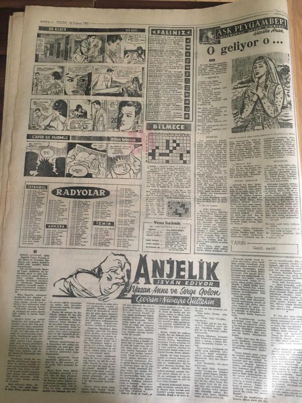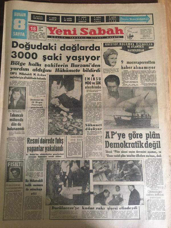 YENİ SABAH GAZETESİ 18 KASIM 1962 YIL :25 SAYI :8508---Doğudaki dağlarda 3000 şaki yaşıyor ---Tabancalı mühendis dün de bulunamadı ---Eminsu MDO ve SDK aleyhinde ---Resmi dairede fuhuş yapanlar yakalandı ---AP 'ye göre plan demokratik değil ---Küfür Oyunu : Siyavuşgil ---85 bin liralık tebligat yolsuzluğu ile ilgili 2 kişi daha tevkif edildi ---Sinemalar :Atlas :Maceralar Yolunda ,İnci : Çam Sakızı ,Konak :Casuslar Çarpışıyor ---İki genç ,Salihli gar gişesini soymak istedi ---Galatasaray -Bytom --Bu gece Yugoslavya ile finali oynuyoruz ---K.Paşa :1 İz.Spor :0---Vefa 'nın yeni tertibi A.Ordu ile yenişemedi ---Sürpriz :K.Yaka D.Sporu 1-0 yendi ---- Sinema Tiyatro :Artık Yerli Film Kompleksinden Kurtulmalıyız ---Mylene Demongeot ---Tijen Par 'a dikkat ediniz --- Belgin Doruk ,Göksel Arsoy : Ayımasalı ,Çikolata ,Sevgilim ,Çalı Kuşu ---Uğur Başaran :Sahneye ablası hastalanınca apar topar çıktı ---Hayat Bazen Tatlıdır :Zeki Müren ,Belgin Doruk , Suna Pekuysal --, SAFA KILIÇLIOĞLU tarafından kaleme alınmıştır. Kitap 1962 yılında [YENİ SABAH MATBAA] o ISBN kodu ile yayınlanmıştır. 8 sayfadır. YENİ SABAH GAZETESİ 18 KASIM 1962 YIL :25 SAYI :8508---Doğudaki dağlarda 3000 şaki yaşıyor ---Tabancalı mühendis dün de bulunamadı ---Eminsu MDO ve SDK aleyhinde ---Resmi dairede fuhuş yapanlar yakalandı ---AP 'ye göre plan demokratik değil ---Küfür Oyunu : Siyavuşgil ---85 bin liralık tebligat yolsuzluğu ile ilgili 2 kişi daha tevkif edildi ---Sinemalar :Atlas :Maceralar Yolunda ,İnci : Çam Sakızı ,Konak :Casuslar Çarpışıyor ---İki genç ,Salihli gar gişesini soymak istedi ---Galatasaray -Bytom --Bu gece Yugoslavya ile finali oynuyoruz ---K.Paşa :1 İz.Spor :0---Vefa 'nın yeni tertibi A.Ordu ile yenişemedi ---Sürpriz :K.Yaka D.Sporu 1-0 yendi ---- Sinema Tiyatro :Artık Yerli Film Kompleksinden Kurtulmalıyız ---Mylene Demongeot ---Tijen Par 'a dikkat ediniz --- Belgin Doruk ,Göksel Arsoy : Ayımasalı ,Çikolata ,Sevgilim ,Çalı Kuşu ---Uğur Başaran :Sahneye ablası hastalanınca apar topar çıktı ---Hayat Bazen Tatlıdır :Zeki Müren ,Belgin Doruk , Suna Pekuysal -- adlı eser Türkçe dilindedir.