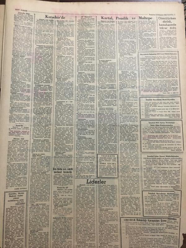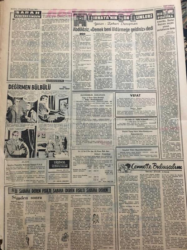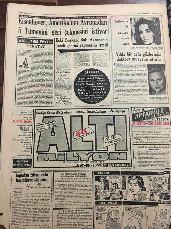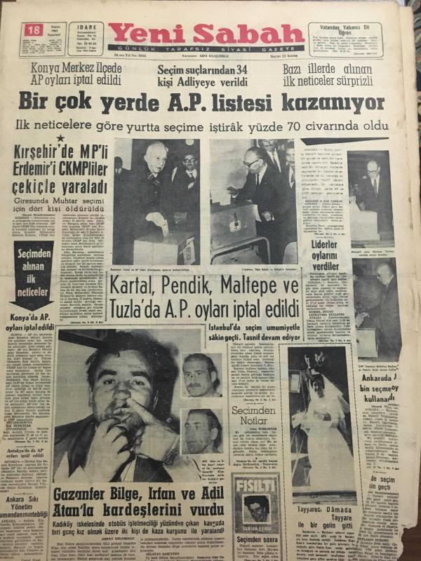 YENİ SABAH GAZETESİ 18 KASIM 1963 YIL :26 SAYI :8866--Bir çok yerde AP listesi kazanıyor --Kırşehir de MP li Erdemir i CKMP liler Çekiçle Yaraladı ---Kartal ,Pendik ,Maltepe ve Tuzla da AP Oyları İptal Edildi ---Gazanfer Bilge ,İrfan ve Adil Atan la kardeşlerini vurdu ---Seçimden Notlar --Türkiye -Belçika : Siyavuşgil ---Eisenhover Amerika nın Avrupa dan 5 Tümenini Geri Çekmesini İstiyor ---Sinema Tiyatro ,Radyo ---Tenesse Wıllıams ın güzel bir eseri :Dövme Gül --H.Tepe :1 D.Spor :0 Beşiktaş ,Gençlerbirliği ni rahat yendi :4-0--Fenerbahçe K.Paşayı 3-0 mağlup etti ---Feriköy ün galibiyet serisi devam ediyor ---Meydan dövüşü halinde geçen maçta Milan ı 1-0 yenen : Santos Dünya Şampiyonu ---Ankara Sıkı Yönetim Kumandanın Tebliği ---Konya da AP Oyları İptal Edildi --Seçim suçlarından 34 kişi Adliyeye Verildi ---Bazı İllerde alınan ilk neticeler sürprizli ---İlk neticelere göre yurtta seçime iştirak yüzde 70 civarında oldu --- Yıpranma, sararmalar, kupon kesiği ve yırtılmalar zamana bağlı olarak görülebilir.
