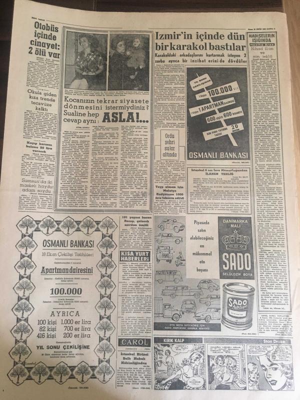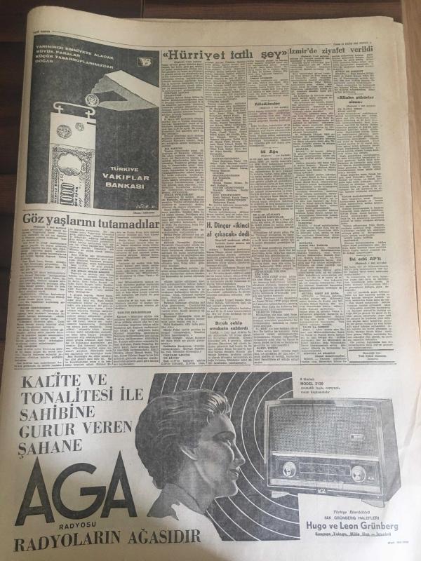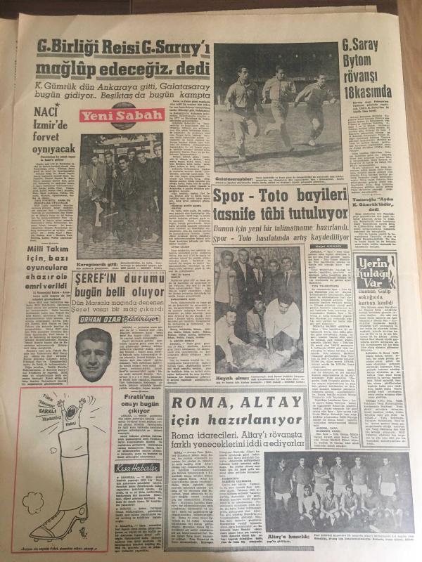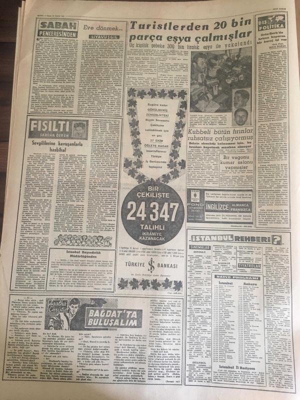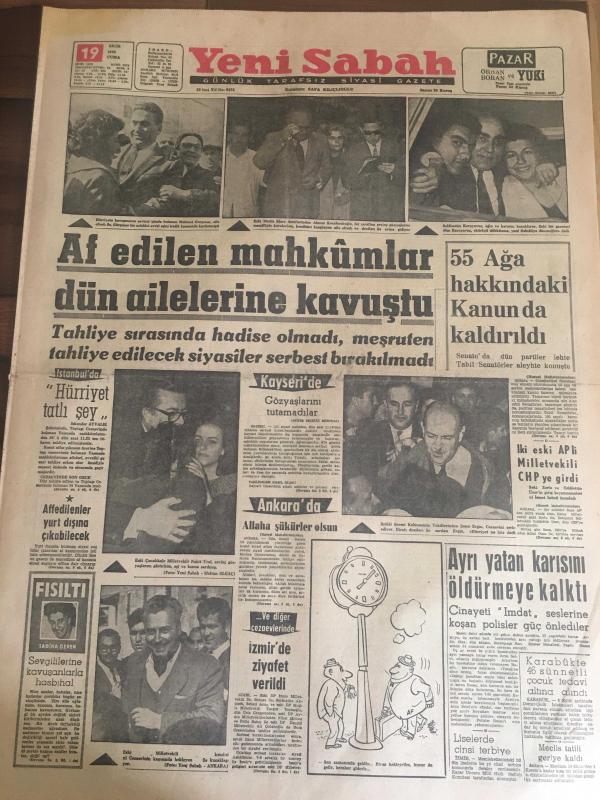YENİ SABAH GAZETESİ 19 EKİM 1962 YIL :25 SAYI :8478---Af edilen mahkumlar dün ailelerine kavuştu --55 Ağa hakkındaki kanun da kaldırıldı Affedilen yurt dışına çıkabilecek --Ayrı yatan karısını öldürmeye kalktı ---Eve dönmek :Siyavuşgil --Turistlerde 20 bin parça eşya çalmışlar --İzmir 'in içinde dün bir karakol bastılar ---Kennedy ,bir Zenci için 23600 eri seferber etti --G.Birliği Reisi Galatasaray 'ı Mağlup Edeceğiz Dedi --Naci İzmir de forvet oynayacak --Şeref 'in durumu bugün belli oluyor --Spor -Toto bayileri tasnife tabi tutuluyor --Galatasaray Bytom Rövanşını 18 Kasım da --Roma Altay İçin Hazırlanıyor -- Yıpranma, sararmalar, kupon kesiği ve yırtılmalar zamana bağlı olarak görülebilir.