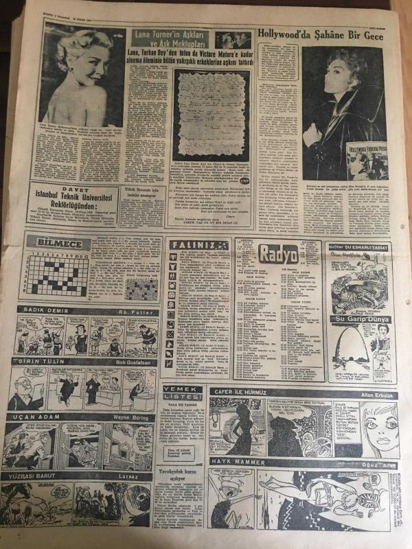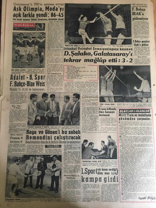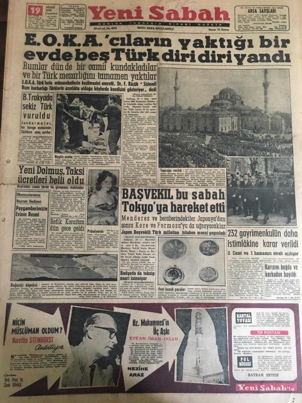 YENİ SABAH GAZETESİ 19 NİSAN 1958 YIL :20 SAYI :6871---EOKA 'cıların yaktığı bir evde beş Türk diri diri yandı --Batı Trakya da sekiz Türk vuruldu ----Yeni Dolmuş Taksi Ücretleri Belli Oldu ---Başvekil bu sabah Tokyo 'ya hareket etti --232 gayrımenkulün daha istimlakine karar verildi --Bize mahsus manzaralar :Siyavuşgil ---İkramiye alan memurlar çarşıdaki faaliyet arttırdı ---Şehrimizde iki lüks sinema kazandı --Beyoğlu evlendirme dairesinde 5 dakika da nikah kıyılıyor ----Enterpol İstanbul Bürosu Fiilen Çalışmağa Başladı ---Sinema :Bu haftadaki Filmler :Can Yoldaşı , Üçüncü Anahtar ,Kolejli Kızlar ,---Aşk Olimpia ,Moda 'yı açık farkla yendi :86-45---D.Şafaka ,Galatasaray 'ı tekrar mağlup etti :3-2--Adalet -B.Spor Fenerbahçe -Blau Weis ---Kaya ve Gönen 'i bu sabah Remondini çalıştıracak --- Yıpranma, sararmalar, kupon kesiği ve yırtılmalar zamana bağlı olarak görülebilir.