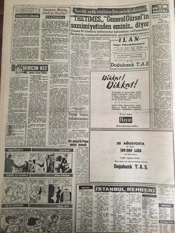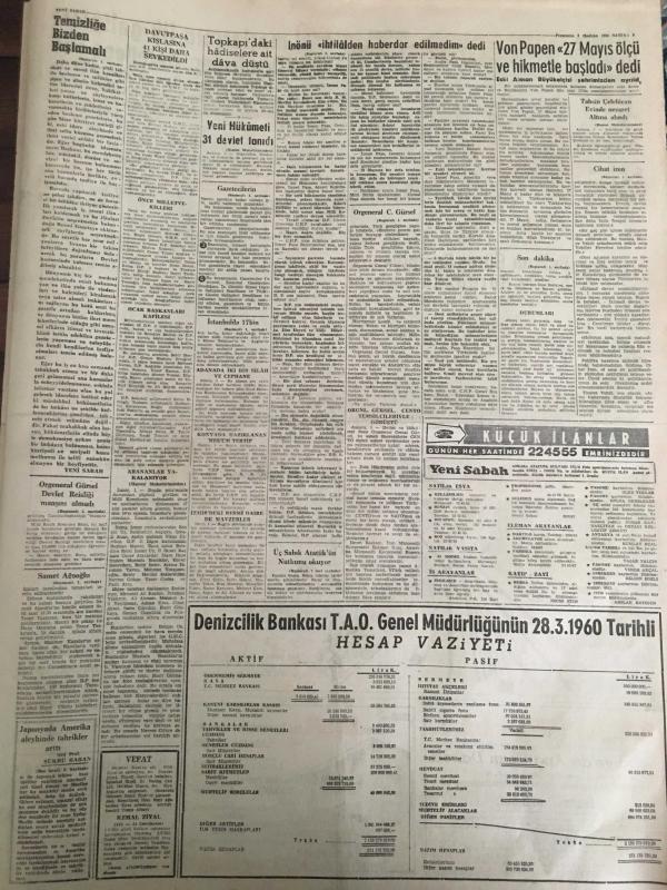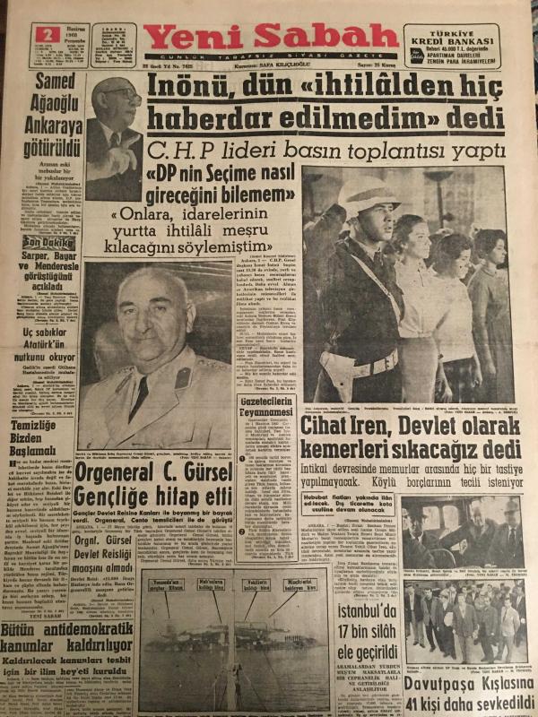 YENİ SABAH GAZETESİ 2 HAZİRAN 1960 YIL :23 SAYI :7625--Samed Ağaoğlu Ankara ya götürüldü--İnönü ,dün ihtilalden hiç haberdar edilmedim dedi ---Sarper ,Bayar ve Menderesle görüştüğünü açıkladı --Üç sabıklar Atatürk ün nutkunu okuyor ---Orgeneral C.Gürsel Gençliğe Hitap Etti --Cihat İren,Devlet Olarak Kemerleri Sıkacağız Dedi --İstanbul da 17 bin silah ele geçirildi --Bütün antidemokratik kanunlar kaldırılıyor --Nereye Böyle Mebus Beyler ?: Siyavuşgil --THETIMES General Gürsel in Samimiyetinden Eminiz Diyor ---Baraj maçlarının ilk galipleri Adana Demirspor ,Hacettepe PTT ---On kulüp transfer için anlaştı ---Balkan Güreş Şampiyonası Bugün Burgaz da Başlıyor --Orgnl.Gürsel Devlet Reisliği Maaşını Almadı --Gazetecilerin Beyannamesi -- Yıpranma, sararmalar, kupon kesiği ve yırtılmalar zamana bağlı olarak görülebilir.