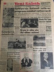 YENİ SABAH GAZETESİ 2 TEMMUZ 1959 YIL :22 SAYI :7300--Türkiye nin iktisadi istikrar programı müsbet netice verdi --Defterdarlık dolandırıldı ---Bu sene bir miktar şeker ithal edilmesi muhtemel ---Atina da Türk -Yunan temasları başlıyor --İnönü yarın Ankara ya avdet ediyor --Heinrich Luebcke B.Almanya nın yeni Cumhurreisi oldu --Türkiye de bir milyon çocuk tahsil yapamıyor --Bir Alman talim uçağı Manyas gölüne düştü --Halk Oyunları :Siyavuşgil --İstanbul Rehberi ---Kolombiya da sellerden 180 kişi öldü --Kaçakçılıkla ilgili 3 kişi daha yakalandı --Bir yabancı şirket de 250 işçiye yol veriyor --Bir jandarma eri tüfekle öldürüldü --Belediye ,plajları yüzde 30 ucuzlatıyor --Yedi döviz kaçakçısı mahkum oldu ---B.Ahmet ,Mustafa ve Cemil Galatasaray da ---Kaleci Salahattin G.Birliğine giriyor --Fenerbahçe camiası iki gruba ayrıldı --Basın kupası boks maçları --Bu sene ki milli maçlar belli oldu --Eisenhower in enteresan bir basın toplantısı--Ateşe mermi atan 5 çocuk parçalandı -- adlı eser, Kitap > Süreli Yayınlar > Gazeteler > Türkiye > Genel > Günlük kategorisinde İkinci El olarak satıştadır.