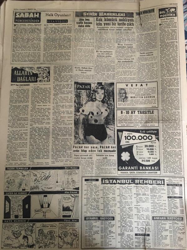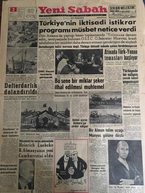 YENİ SABAH GAZETESİ 2 TEMMUZ 1959 YIL :22 SAYI :7300--Türkiye nin iktisadi istikrar programı müsbet netice verdi --Defterdarlık dolandırıldı ---Bu sene bir miktar şeker ithal edilmesi muhtemel ---Atina da Türk -Yunan temasları başlıyor --İnönü yarın Ankara ya avdet ediyor --Heinrich Luebcke B.Almanya nın yeni Cumhurreisi oldu --Türkiye de bir milyon çocuk tahsil yapamıyor --Bir Alman talim uçağı Manyas gölüne düştü --Halk Oyunları :Siyavuşgil --İstanbul Rehberi ---Kolombiya da sellerden 180 kişi öldü --Kaçakçılıkla ilgili 3 kişi daha yakalandı --Bir yabancı şirket de 250 işçiye yol veriyor --Bir jandarma eri tüfekle öldürüldü --Belediye ,plajları yüzde 30 ucuzlatıyor --Yedi döviz kaçakçısı mahkum oldu ---B.Ahmet ,Mustafa ve Cemil Galatasaray da ---Kaleci Salahattin G.Birliğine giriyor --Fenerbahçe camiası iki gruba ayrıldı --Basın kupası boks maçları --Bu sene ki milli maçlar belli oldu --Eisenhower in enteresan bir basın toplantısı--Ateşe mermi atan 5 çocuk parçalandı --, SAFA KILIÇLIOĞLU tarafından kaleme alınmıştır. Kitap 1959 yılında [YENİ SABAH MATBAA] o ISBN kodu ile yayınlanmıştır. 6 sayfadır. YENİ SABAH GAZETESİ 2 TEMMUZ 1959 YIL :22 SAYI :7300--Türkiye nin iktisadi istikrar programı müsbet netice verdi --Defterdarlık dolandırıldı ---Bu sene bir miktar şeker ithal edilmesi muhtemel ---Atina da Türk -Yunan temasları başlıyor --İnönü yarın Ankara ya avdet ediyor --Heinrich Luebcke B.Almanya nın yeni Cumhurreisi oldu --Türkiye de bir milyon çocuk tahsil yapamıyor --Bir Alman talim uçağı Manyas gölüne düştü --Halk Oyunları :Siyavuşgil --İstanbul Rehberi ---Kolombiya da sellerden 180 kişi öldü --Kaçakçılıkla ilgili 3 kişi daha yakalandı --Bir yabancı şirket de 250 işçiye yol veriyor --Bir jandarma eri tüfekle öldürüldü --Belediye ,plajları yüzde 30 ucuzlatıyor --Yedi döviz kaçakçısı mahkum oldu ---B.Ahmet ,Mustafa ve Cemil Galatasaray da ---Kaleci Salahattin G.Birliğine giriyor --Fenerbahçe camiası iki gruba ayrıldı --Basın kupası boks maçları --Bu sene ki milli maçlar belli oldu --Eisenhower in enteresan bir basın toplantısı--Ateşe mermi atan 5 çocuk parçalandı -- adlı eser Türkçe dilindedir.