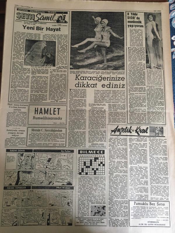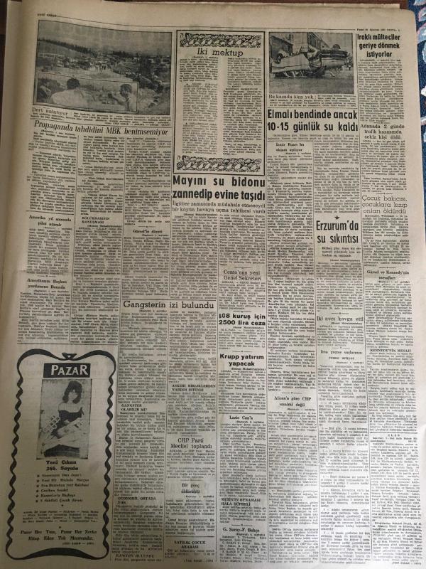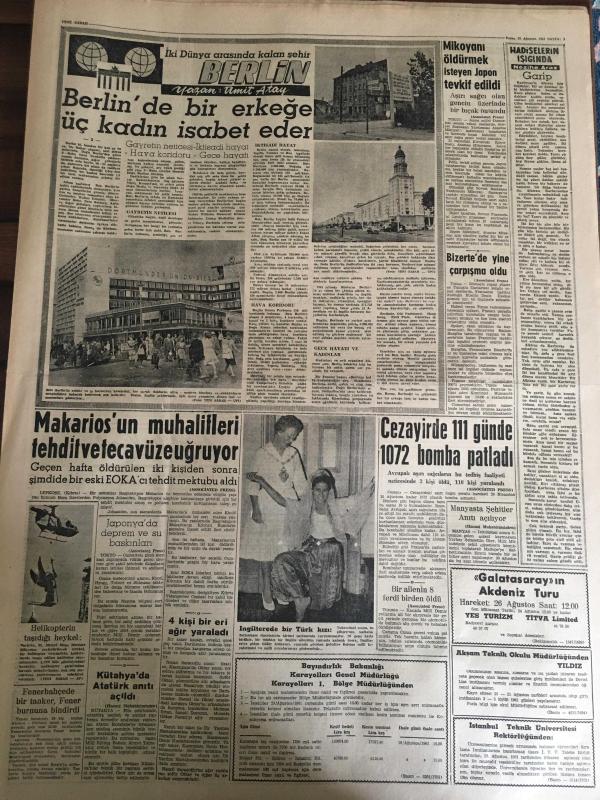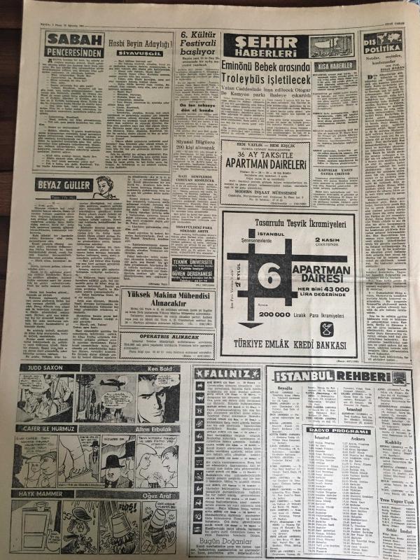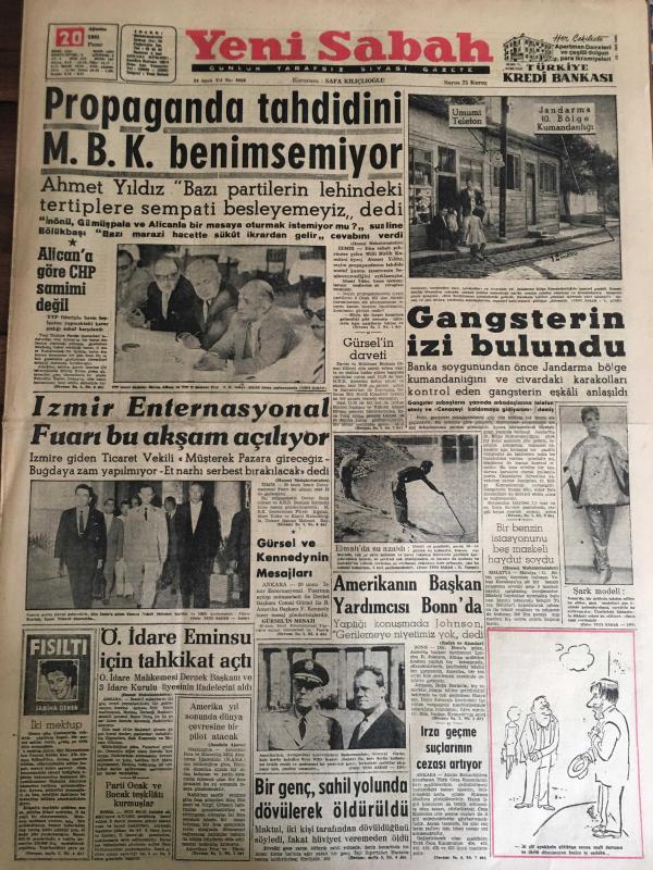 YENİ SABAH GAZETESİ 20 AĞUSTOS 1961 YIL :24 SAYI :8058--Propaganda tahdidini MBK benimsemiyor --İzmir Enternasyonal Fuarı bu akşam açılıyor ---Gangsterin izi bulundu --Ö.İdare Eminsu için tahkikat açtı --Amerika nın Başkan Yardımcısı Bonn da --Bir genç ,sahil yolunda dövülerek öldürüldü ---Hasbi Beyin Adaylığı !:Siyavuşgil ---Radyo Programları --Makarios un muhalifleri tehdit ve tecavüze uğruyor ---Cezayir de 11 günde 1072 bomba patladı ---Mikoyanı öldürmek isteyen Japon tevkif edildi ---Japonya deprem ve su baskınları --8 Yıldır DIOR da mankenlik yapıyorum --Lazio Cana 2 sene için 33 bin dolar teklif etti --Galatasaray Hapoel i dün 3-1 mağlup etti ---Finali Fletcher le Hewitt oynuyor ---Beşiktaş İzmir de Altay a 2-0 mağlup ---Galatasaray :2 Fenerbahçe :1 ---Fenerbahçe ,Partizan Takımı ile Karşılaşıyor ---Gürsel ve Kennedy nin mesajları --Irza geçme suçlarının cezası artıyor -- Yıpranma, sararmalar, kupon kesiği ve yırtılmalar zamana bağlı olarak görülebilir.