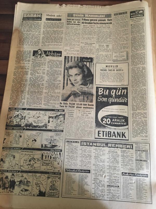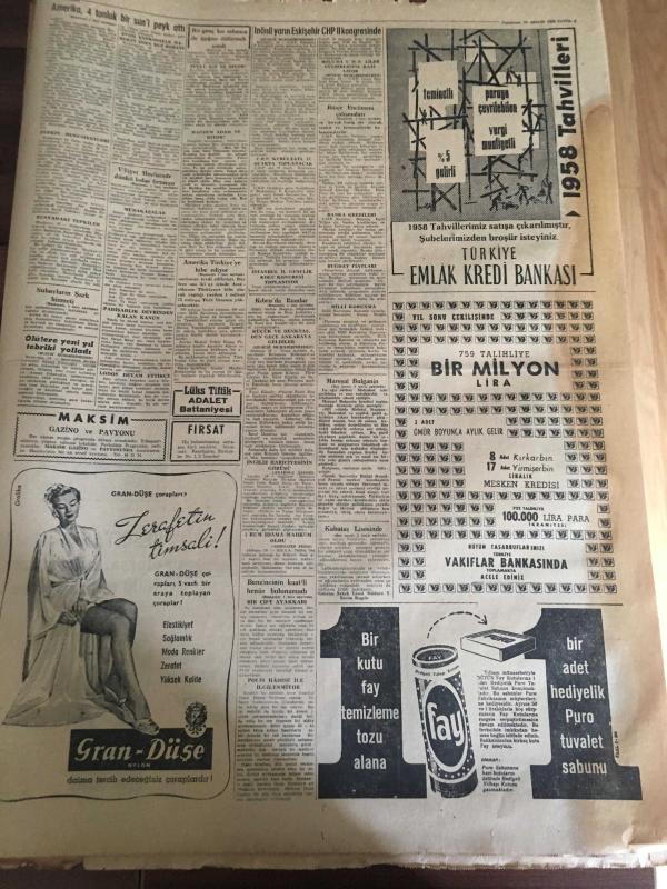 YENİ SABAH GAZETESİ 20 ARALIK 1958 YIL :21 SAYI :7111---Amerika 4 tonluk bir suni peyk attı ---Amerika Türkiye ye 850 milyon tl hibe ediyor --Kıbrıs da Rumlar dün iki Türk 'ü yaraladılar --Meclis de üç sözlü soruya cevap verildi --Benzincinin katili henüz bulunamadı --Vilayet Meclisinde Dünkü Lodos Fırtınası ---Yılbaşı gecesi yemek fiyatı 40 liradan fazla olmayacak --Mareşal Bulganın suçlu olduğu itiraf ediyor --Kredinin temini tensikatı durduracağı yerde arttırdı --Kalifiye tersane işçileri Denizcilik Bankasını Terk Ediyor ---Çaydamar Kömür Ocağındaki Yangın --Mikoyan 'ın Amerika 'yı ziyareti ümit verici --Sinema :Kumpanya ,Çayhane ----N.Sel Prensiplerimden Fedakarlık Etmem diyor --Lig heyecanı tekrar başladı --S.Giz ,Reislikten feragat ediyor ----Beşiktaş dördüncü olursa ,futbolculara 1800 er lira verecek-- Yıpranma, sararmalar, kupon kesiği ve yırtılmalar zamana bağlı olarak görülebilir.