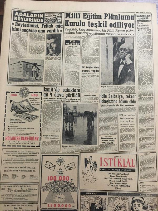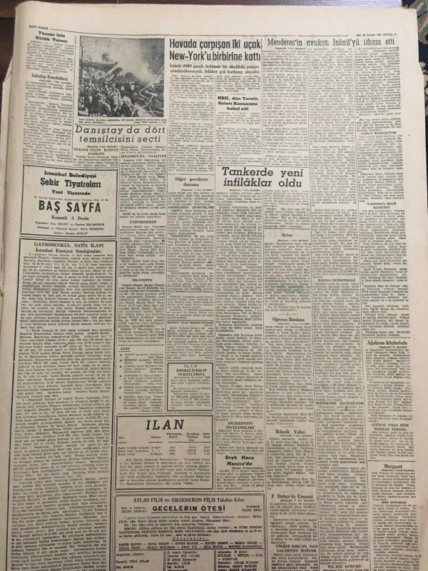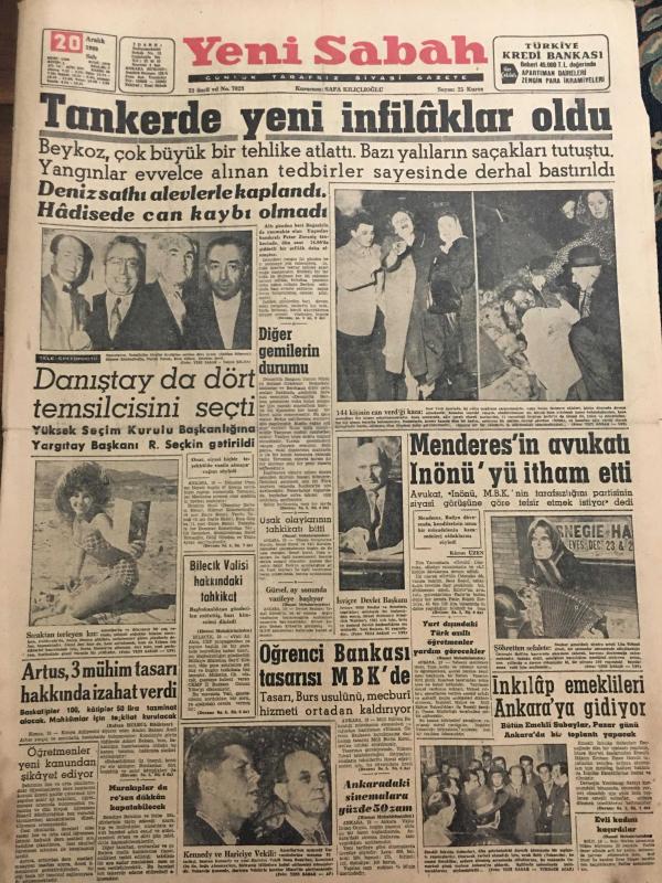 YENİ SABAH GAZETESİ 20 ARALIK 1960 YIL :23 SAYI :7823--Tankerde yeni infilaklar oldu --Danıştay da dört temsilcisini seçti ---Bilecik Valisi Hakkında Tahkikat --Artus 3 mühim tasarı hakkında izahat verdi --Menderes in avukatı İnönü yü itham etti ---Öğrenci Bankası Tasarısı MBK da --İnkılap emeklileri Ankara ya gidiyor --Büyük adam hayranlığı :Siyavuşgil --İstanbul Rehberi ---Milli Eğitim Planlama Kurulu Teşkil Ediliyor --İzmit de sabıklara ait 4 dava görüldü --Haile Selasiye tekrar Habeşistan a hakim oldu ---Havada çarpışan iki uçak New-York u birbirine kattı --Fenerbahçe U.Kaptanı Niyazi sel dün istifa etti ---Garbis Jo N gan bu gece karşılaşıyor ---Galatasaraylılar dün kurban kestiler ---Balkan Olimpiyatları 1962 de İhya Ediliyor ---Ankara da ki sinemalara yüzde 50 zam --- Yıpranma, sararmalar, kupon kesiği ve yırtılmalar zamana bağlı olarak görülebilir.
