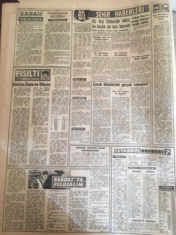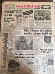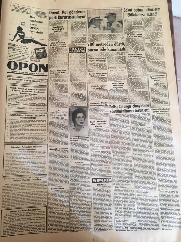 YENİ SABAH GAZETESİ 20 TEMMUZ 1962 YIL :25 SAYI :8387---Peru da asker idareye karşı halk ayaklandı --CHP nin Küçük Kurultay ı Bugün Toplanıyor --Sanayicilere 200 milyon lira kredi açılıyor --Barzani yi öldürmek için tabanca çalıp evden kaçtı --Polis Cihangir cinayetinin katilini nihayet tespit etti ---Bir şilep hamam kubbesine oturdu --Onar ,Konuralpı yine vazifeden alacak ---Dahiliyenin tebliğleri :Siyavuşgil --Dış Olaylar: Kennedy nin yardım planı kabul edildi --Kalkınan memleketler konferansı sona erdi ---1961 Yılında 1.186 bin kişi hacı oldu --Davet :Pul gönderen parti kurucusu oluyor --700 metreden düştü burnu bile kanamadı --Sakat doğan bebeklerin öldürülmesi istendi --Vefa ve D.Spor için karar veriliyor --Yenal Boş dönmem dedi --Beşiktaş a göre Recep politika yapmak istemiş ---Fenerbahçe 5 futbolcuya bonservis veriyor ---Napoli Olimpiyat Hazırlığı Yapıyor ---Okuma bilmeyenlerin nisbeti yüzde altmış --Alam ,yeni İran Başbakanı oldu --Avusturya da işçi istiyor -- Yıpranma, sararmalar, kupon kesiği ve yırtılmalar zamana bağlı olarak görülebilir.