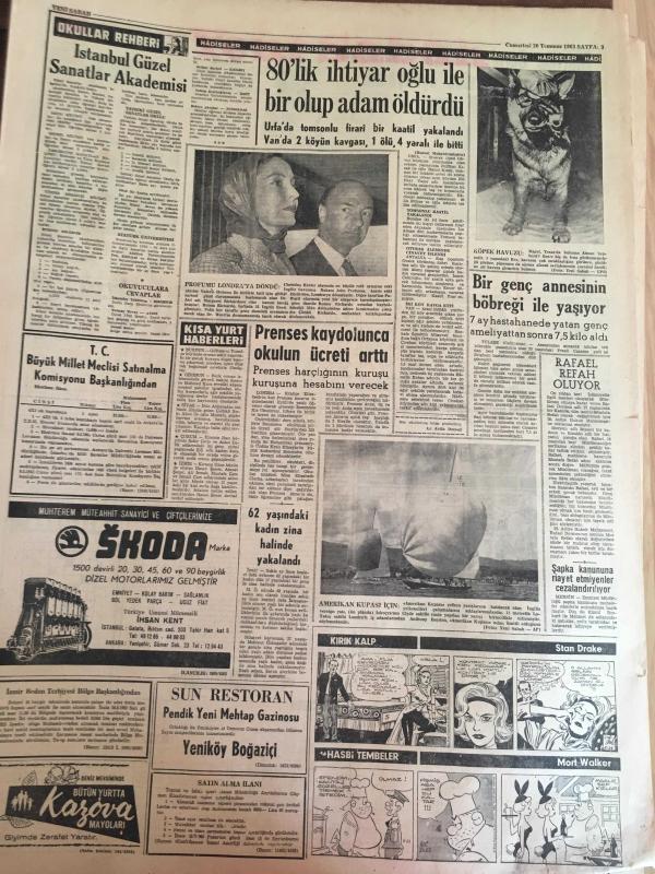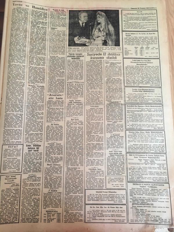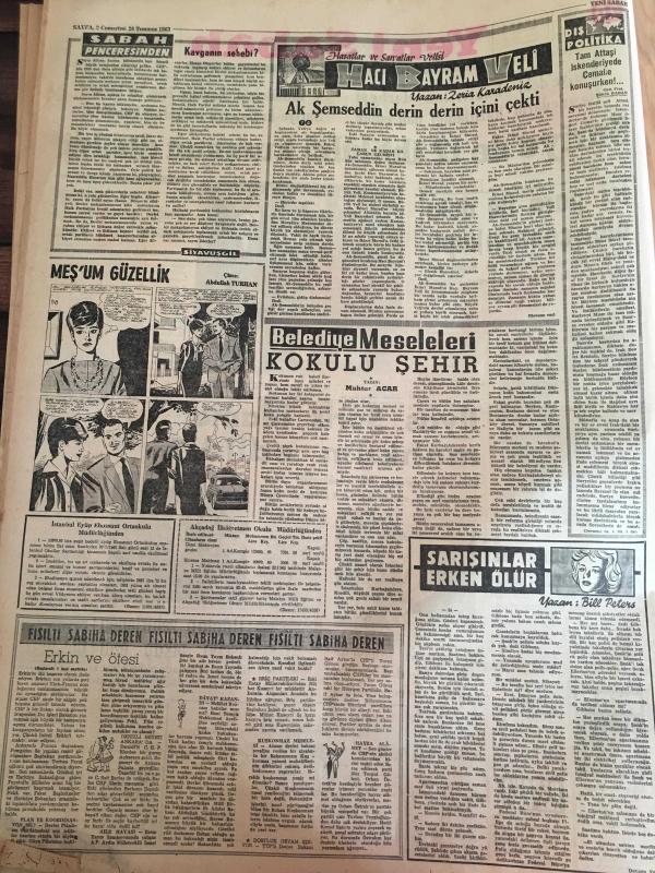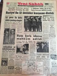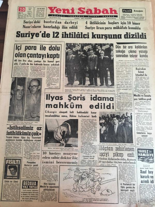 YENİ SABAH GAZETESİ 20 TEMMUZ 1963 YIL :26 SAYI :8746--Suriye de bastırılan darbeyi Nasır 'cıların hazırladığı ilan edildi --Suriye de 12 ihtilalci kurşuna dizildi --İçi para ile dolu olan çantayı kaptı --İlyas Şoris idama mahkum edildi --Dün bir ara kaldırılan sokağa çıkma yasağı sonradan tekrar kondu --İlaçtan zehirlenen işçiyi pikap ezdi --Kavganın Sebebi ?:Siyavuşgil --Martine Coral ,Mariyn Monroe 'ya teklif edilen rolde oynayacak --Sinemalar :Atlas :Dinamik Üçler ,İnci :Cengiz Hanın Hazineleri ,Lüks :Berlin Esrarı ,---80 'lik ihtiyar oğlu ile bir olup adam öldürdü --Prenses kaybolunca okulun ücreti arttı --Satış bedeli açıklandı : Şenol :90 bin ,Birol :72 Bin Lira --Fenerbahçe sezonu kampla açacak --Moskova ,Amerika Rusya ya kıyasla daha şanslı görünüyor --Galatasaray Göztepeli Kaleci Ali İçin İzmir e İdareci Yollayacak -- Yıpranma, sararmalar, kupon kesiği ve yırtılmalar zamana bağlı olarak görülebilir.