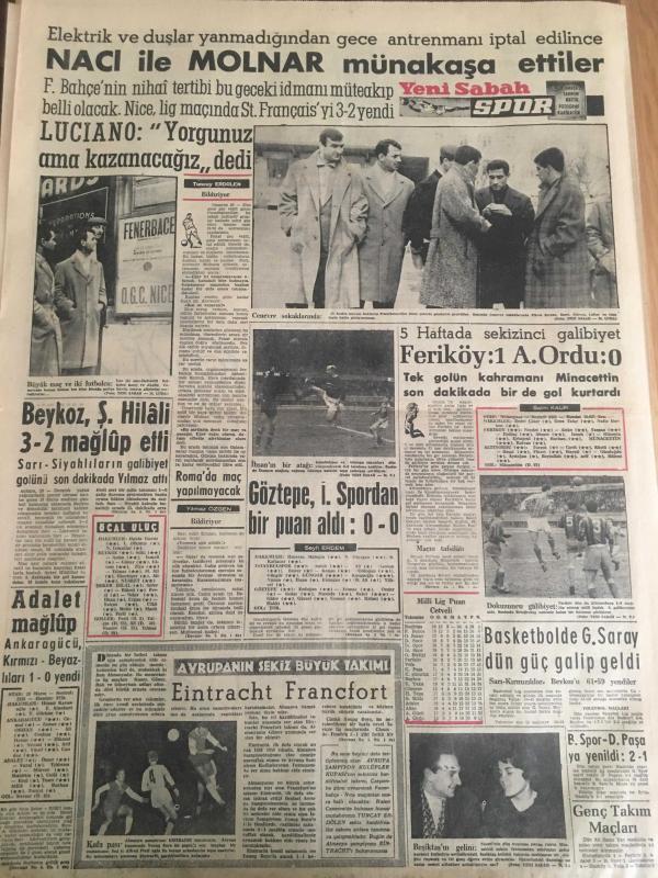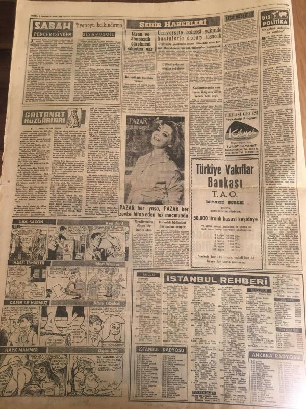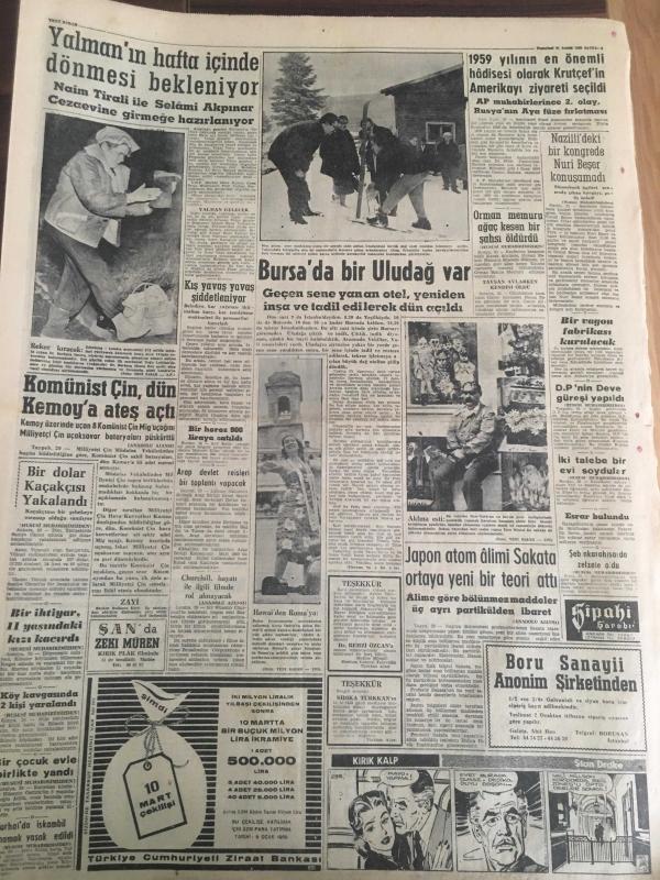 YENİ SABAH GAZETESİ 21 ARALIK 1959 YIL :22 SAYI : 7422---Ara seçimi yapılması ihtimali ortaya çıktı ---Türk basın rejimi tenkid ediliyor ---Şah ile Farah bugün evleniyor ----Urla da ki seçimde iki gazeteci dövüldü ----Otomobil için 3 milyon dolarlık ek kota çıkıyor --Doğu -Batı Zirve Toplantısı Nisan da ----Erzurum CHP Kongresi Sakin Geçti ----Tiyatroyu Kalkındırma : Siyavuşgil ---Sinemalar ,Tiyatrolar ,Radyo Programcıları ---Yalman 'ın hafta içinde dönmesi bekleniyor ---1959 yılının en önemli hadisesi olarak Krutçef 'in Amerika yı ziyareti seçildi --Bursa da bir Uludağ var ---Komünist Çin dün Kemoy a ateş açtı ---Japon atom alimi sakata ortaya yeni bir teori attı ---Polatkan tenkidlere cevap verdi ---NACI ile MOLNAR münakaşa ettiler --Lucıano :Yorgunuz ama kazanacağız dedi ---Beykoz ,Ş .Hilali 3-2 mağlup etti ---Feriköy :1 A.Ordu : 0 Göztepe , İ.Spor dan bir puan aldı : 0-0---Adalet mağlup ---Basketbol da Galatasaray dün güç galip geldi --- Yıpranma, sararmalar, kupon kesiği ve yırtılmalar zamana bağlı olarak görülebilir.