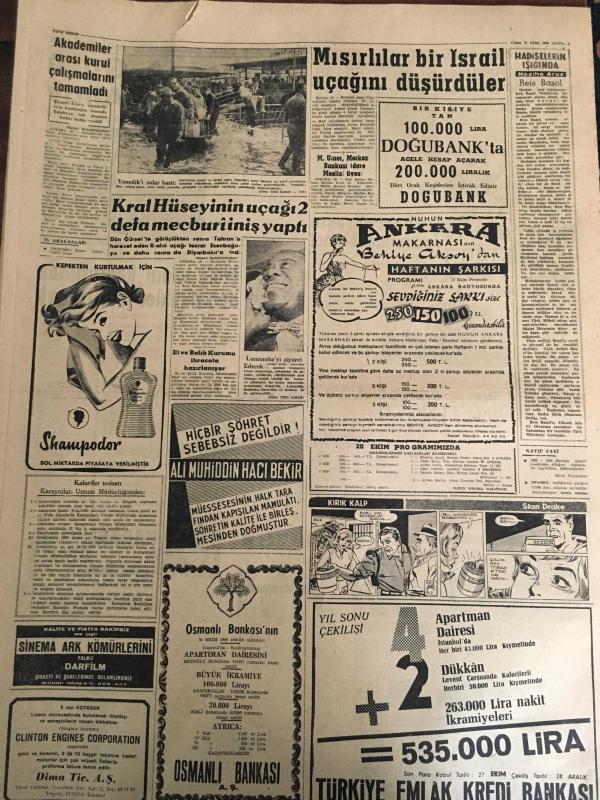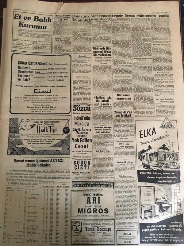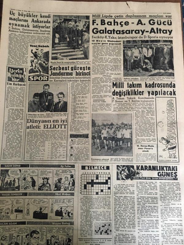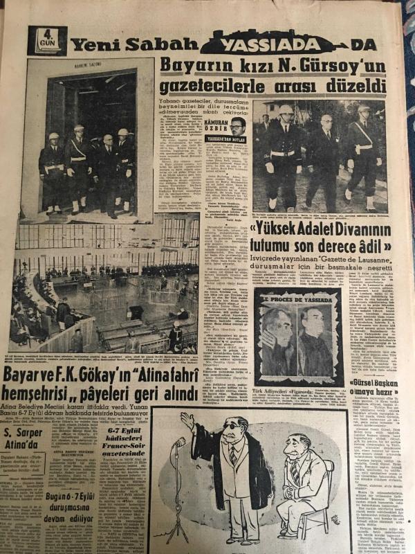 YENİ SABAH GAZETESİ 21 EKİM 1960 YIL :23 SAYI :7763---Bayarla Ökmen müdafaalarını yaptılar : Duruşma karar için pazartesiye bırakıldı --Amerikan 6. filosu Ege de büyük bir tatbikat yaptı --Anayasa Mahkemesi Kararlarını Kesin Olacak ---Gebze civarında iki keşif uçağı çarpıştı ---Vali Refik Tulga 2000 lise öğrencisi ile dün sohbet toplantısı yaptı ---En büyük günahları :Siyavuşgil --İstanbul Rehberi ---Mısırlılar bir İsrail uçağını düşürdüler ---Karl Hüseyin in uçağı 2 defa mecburi iniş yaptı --Üç büyükler kendi maçlarını Ankara da oynamak istiyorlar ---Fenerbahçe -A.Gücü ,Galatasaray -Altay ---Serbest güreşte jandarma birinci --Dünyanın en iyi atleti : Elliott --Milli takım kadrosunda değişiklikler yapılacak --Türkiye de fikir gazeteciliğinin 100. yıldönümü ---Bayar ın kızı N.Gürsoy un gazetecilerle arası düzeldi --Yüksek Adalet Divanının Tutumu Son Derece Adil --Bayar ve F.K Gökay ın Atina fahri hemşehrisi payeleri geri alındı --- Yıpranma, sararmalar, kupon kesiği ve yırtılmalar zamana bağlı olarak görülebilir.