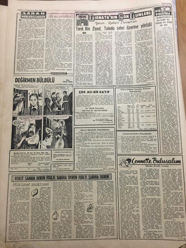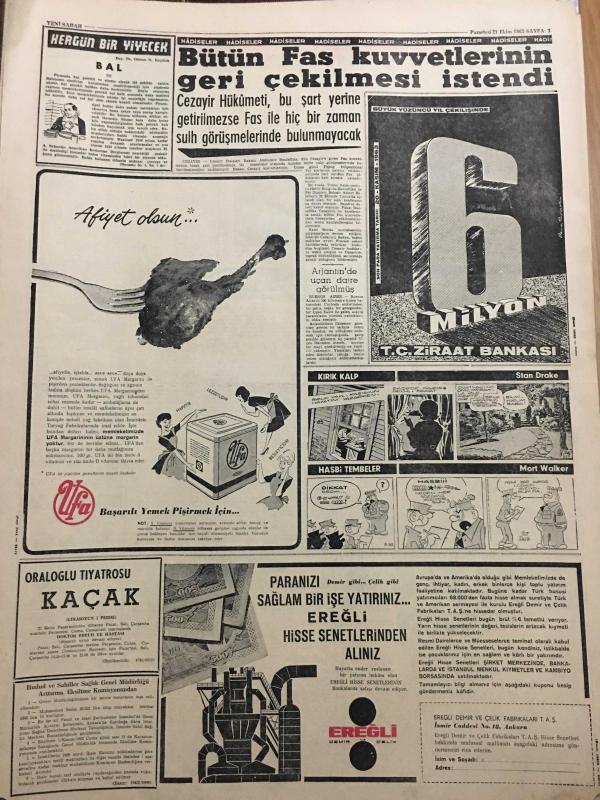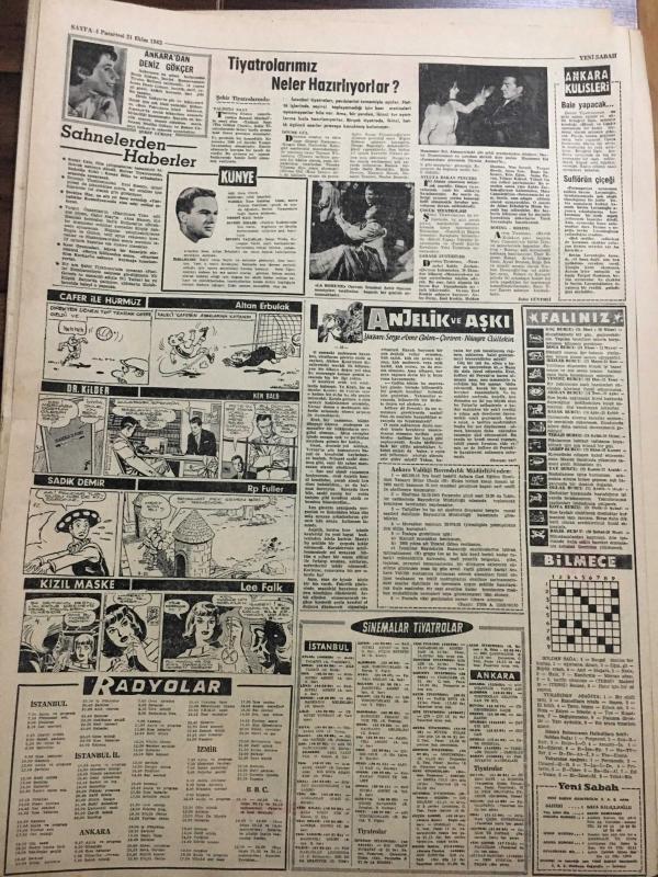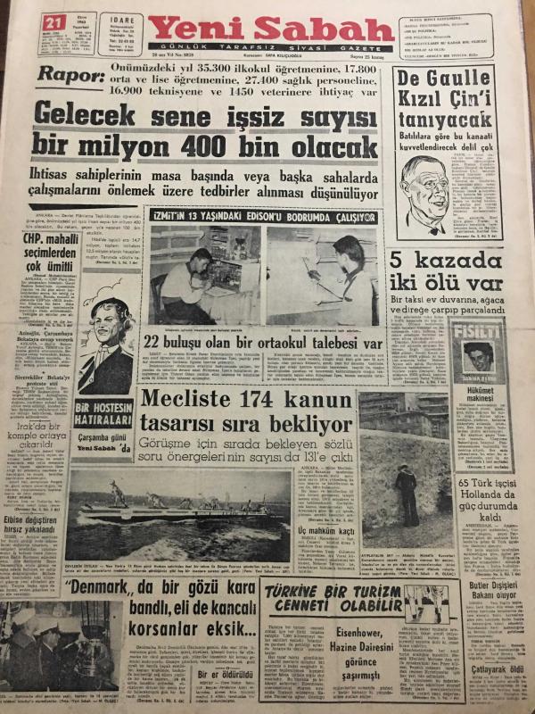 YENİ SABAH GAZETESİ 21 EKİM 1963 YIL :26 SAYI :8838---Gelecek sene işsiz sayısı bir milyon 400 bin olacak ---CHP .Mahalli seçimlerden çok ümitli ---De Gaulle Kızıl Çin 'i tanıyacak --5 kazada iki ölü var --Meclis te 174 kanun tasarısı sıra bekliyor --Ah şu politika :Siyavuşgil ---Bütün Fas Kuvvetlerinin Geri Çekilmesi İstendi ---Ankara dan Deniz Gökçer --Tiyatrolarımız neler hazırlıyorlar ?---Fenerbahçe ,Demirsporu Farklı Mağlup Etti :5-2---Galatasaray ,hıncını A.Ordu dan aldı :3-0---B.Spor ,A.Gücü ne şans tanımadı :2-1--Ankara da Karşıyaka ve Gençlerbirliği galip -- Yıpranma, sararmalar, kupon kesiği ve yırtılmalar zamana bağlı olarak görülebilir.
