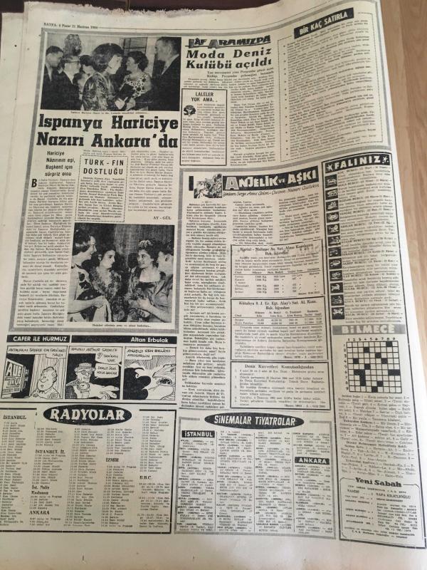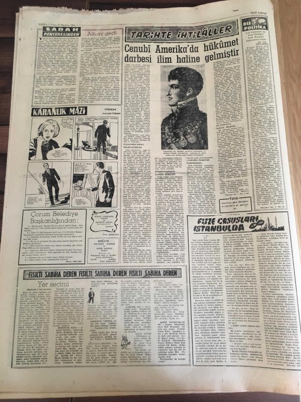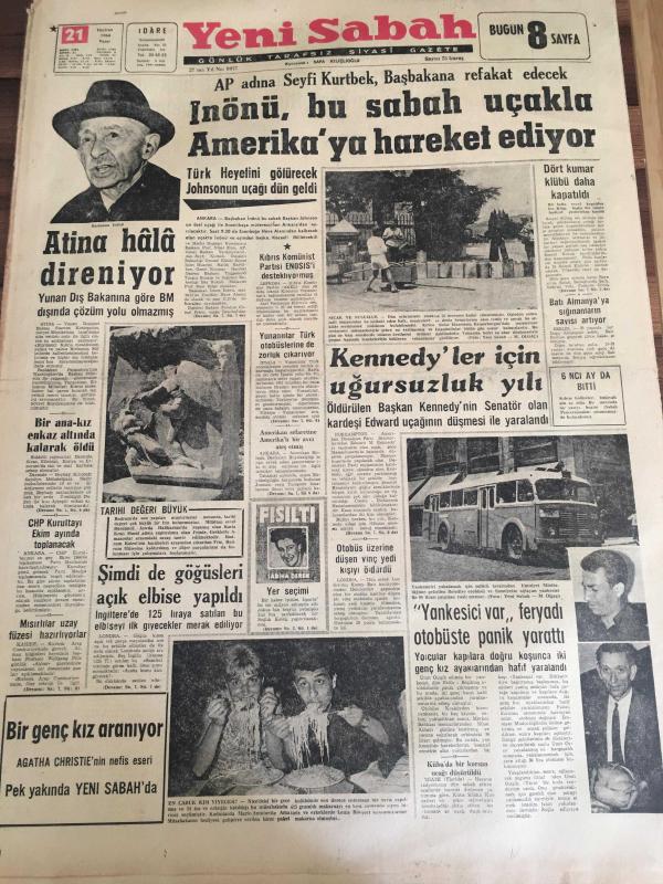 YENİ SABAH GAZETESİ 21 HAZİRAN 1964 YIL :27 SAYI :9077--AP adına Seyfi Kurtbek , Başbakana Refakat Edecek :İnönü ,bu sabah uçakla Amerika 'ya hareket ediyor --Atina hala direniyor --Kennedy 'ler için uğursuzluk yılı --Yankesici var ,feryadı otobüste panik yarattı --Cenubi Amerika da hükümet darbesi ilim halinde gelmiştir --Kirli hava ile mücadele konferansı toplanıyor --İspanya da ki Hariciye Nazırı Ankara da --Galatasaray -Altay --Fenerbahçe Samsun da Yol Spor 'a 2-1 yenildi --Çolpan Beyaz Perdeye döndü ve ilk filmine başladı : Çolpan yeni filminde eşi Sadri Alışık ,Hülya Koçyiğit ve Ediz Hun birlikte oynayacak--Eskişehir 'in başarılı oyuncusu N. Karacan -- Başpehlivan M. Ali Yağcı ve Bisiklet Hasan Kılıç --Alman Toto Kralı Sokak Süpürüyor -- Yıpranma, sararmalar, kupon kesiği ve yırtılmalar zamana bağlı olarak görülebilir.