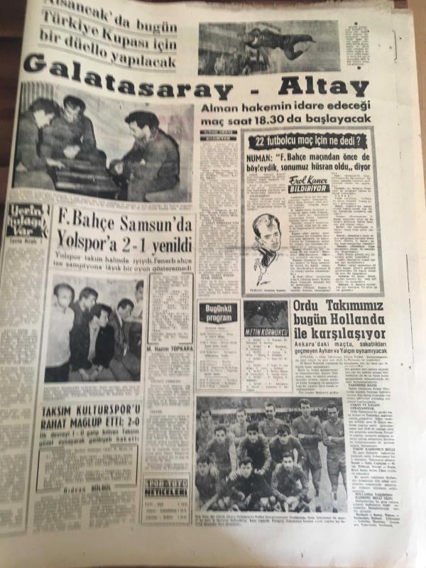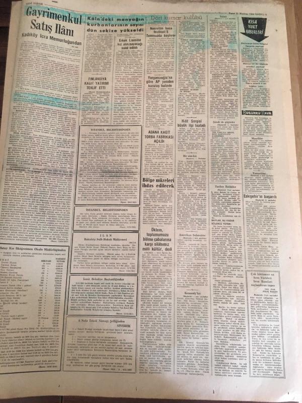 YENİ SABAH GAZETESİ 21 HAZİRAN 1964 YIL :27 SAYI :9077--AP adına Seyfi Kurtbek , Başbakana Refakat Edecek :İnönü ,bu sabah uçakla Amerika 'ya hareket ediyor --Atina hala direniyor --Kennedy 'ler için uğursuzluk yılı --Yankesici var ,feryadı otobüste panik yarattı --Cenubi Amerika da hükümet darbesi ilim halinde gelmiştir --Kirli hava ile mücadele konferansı toplanıyor --İspanya da ki Hariciye Nazırı Ankara da --Galatasaray -Altay --Fenerbahçe Samsun da Yol Spor 'a 2-1 yenildi --Çolpan Beyaz Perdeye döndü ve ilk filmine başladı : Çolpan yeni filminde eşi Sadri Alışık ,Hülya Koçyiğit ve Ediz Hun birlikte oynayacak--Eskişehir 'in başarılı oyuncusu N. Karacan -- Başpehlivan M. Ali Yağcı ve Bisiklet Hasan Kılıç --Alman Toto Kralı Sokak Süpürüyor -- adlı eser, Kitap > Süreli Yayınlar > Gazeteler > Türkiye > Genel > Günlük kategorisinde İkinci El olarak satıştadır.