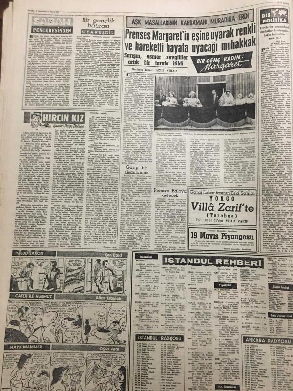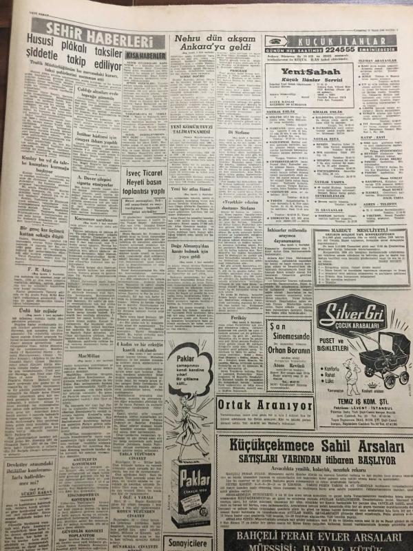 YENİ SABAH GAZETESİ 21 MAYIS 1960 YIL :23 SAYI :7612---Nehru dün akşam Ankara ya geldi --Macmillan Nato işbirliği daha sıkı olmalıdır dedi ---Yeni bir Atlas Füzesi mesafe rekoru kırdı ---Sıcaklar bastırdı --Üç trafik kazasında 4 kişi öldü --4 Kadın ve 1 erkeğin kaatili yakalandı ---D.Almanya dan kızını bulmak için yaya geldi ---Kocasının şarabına zehir katıp öldürmüş ---Bir gençlik Hatırası :Siyavuşgil --Cam Sanayinde 500 kadar işçi işsiz kaldı ---33000 köye 65 yılda elektrik verilecek --Von Popen rahatsızlandı ---Sinema : Yaman Hafiye ,Kanlı Geçit ,Hayaller Şehri ---Lig sonuncuları Bursa da kozlarını paylaşıyorlar --Beşiktaş ve Fenerbahçe Adana da dün tezahüratla karşılandı ---Sofya atletizm mitingine 10 millet iştirak ediyor ---Feriköy İsviçre de ilk maçını 2-1 kazandı ---15 Torun sahibi kadın kaçırıldı ---3 Peynir taciri yolda soyuldu --İzmir de bir otel yandı -- Yıpranma, sararmalar, kupon kesiği ve yırtılmalar zamana bağlı olarak görülebilir.