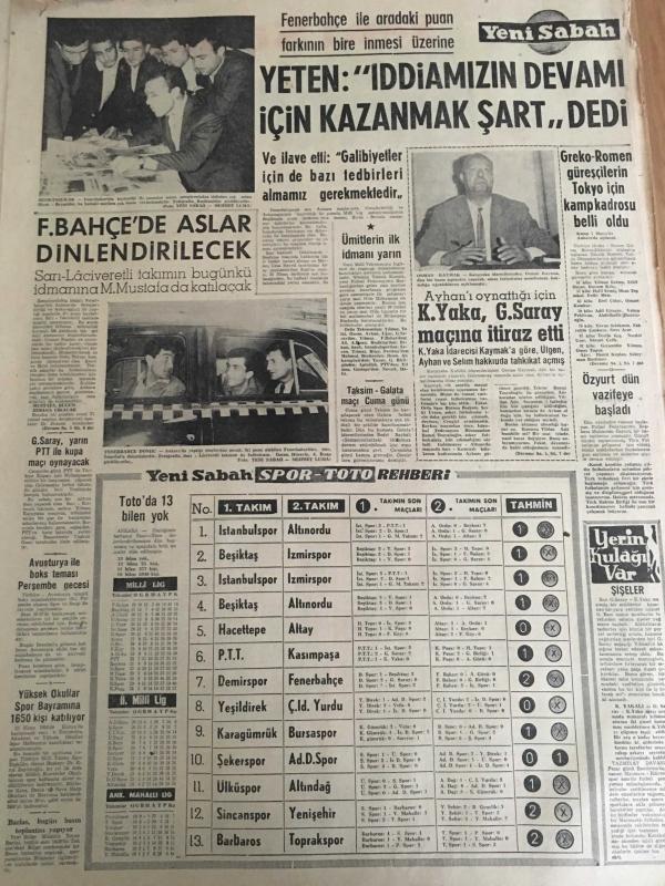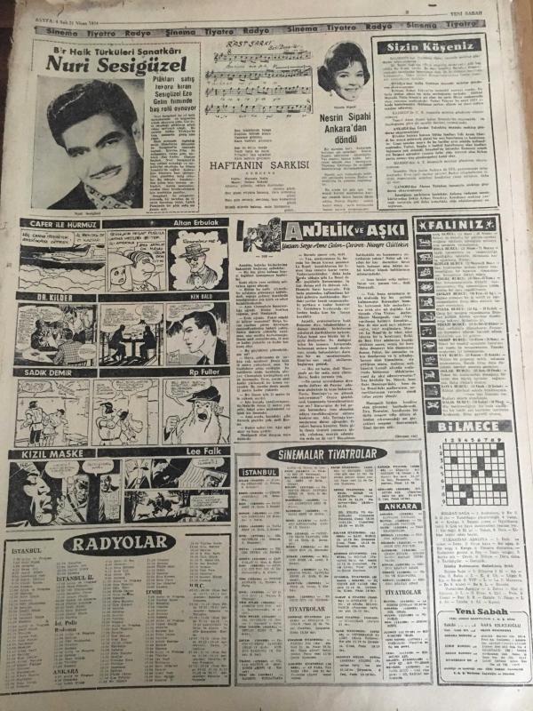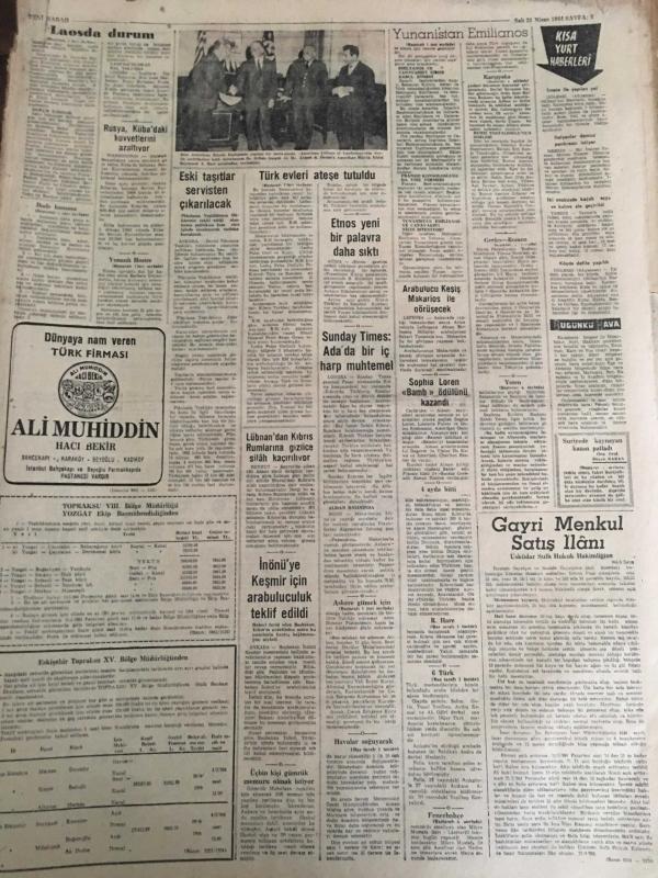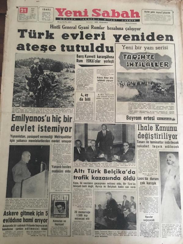 YENİ SABAH GAZETESİ 21 NİSAN 1964 YIL :26 SAYI :9019---Türk evleri yeniden ateşe tutuldu --Emilyanos 'u hiç bir devlet istemiyor --İhale Kanunu Değiştiriliyor ---Altı Türk Belçika da Trafik Kazasında Öldü ---Askere gitmek için 5 evladına hami arıyor ----Laos da durum çok karışık ----Sadık Müttefik :Siyavuşgil --Sinemalar ,Tiyatrolar ,Radyo Programları ---Hac için 300 bine yakın Müslüman Mekke de Toplandı ---Margareth Lee Yeni Bir Film Hazırlayacak ---7-8 kişinin öldürüldüğüne dair yapılan ihbar doğru çıktı ---Bir Halk Türküleri Sanatkarı :Nuri Sesigüzel ---Nesrin Sipahi Ankara dan döndü ---Yeten : İddiamızın devamı için kazanmak şart dedi --Fenerbahçe de aslar dinlendirecek ---K.Yaka ,Galatasaray maçına itiraz etti --Greko -Romen Güreşçilerin Tokyo için Kamp Kadrosu Belli Oldu ---Kıbrıs Alayı atış tatbikatı yapıyor ---Barış Kuvveti Karargahına Rum EOKA yerleşti --20 memurluğa 1.500 kişi müracaat etti ---Yeni Bir Yazı Serisi :Tarihte İhtilaller --- Yıpranma, sararmalar, kupon kesiği ve yırtılmalar zamana bağlı olarak görülebilir.