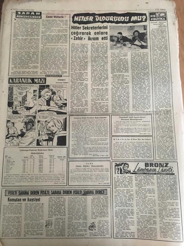 YENİ SABAH GAZETESİ 21 NİSAN 1964 YIL :26 SAYI :9019---Türk evleri yeniden ateşe tutuldu --Emilyanos 'u hiç bir devlet istemiyor --İhale Kanunu Değiştiriliyor ---Altı Türk Belçika da Trafik Kazasında Öldü ---Askere gitmek için 5 evladına hami arıyor ----Laos da durum çok karışık ----Sadık Müttefik :Siyavuşgil --Sinemalar ,Tiyatrolar ,Radyo Programları ---Hac için 300 bine yakın Müslüman Mekke de Toplandı ---Margareth Lee Yeni Bir Film Hazırlayacak ---7-8 kişinin öldürüldüğüne dair yapılan ihbar doğru çıktı ---Bir Halk Türküleri Sanatkarı :Nuri Sesigüzel ---Nesrin Sipahi Ankara dan döndü ---Yeten : İddiamızın devamı için kazanmak şart dedi --Fenerbahçe de aslar dinlendirecek ---K.Yaka ,Galatasaray maçına itiraz etti --Greko -Romen Güreşçilerin Tokyo için Kamp Kadrosu Belli Oldu ---Kıbrıs Alayı atış tatbikatı yapıyor ---Barış Kuvveti Karargahına Rum EOKA yerleşti --20 memurluğa 1.500 kişi müracaat etti ---Yeni Bir Yazı Serisi :Tarihte İhtilaller --- adlı eser, Kitap > Süreli Yayınlar > Gazeteler > Türkiye > Genel > Günlük kategorisinde İkinci El olarak satıştadır.