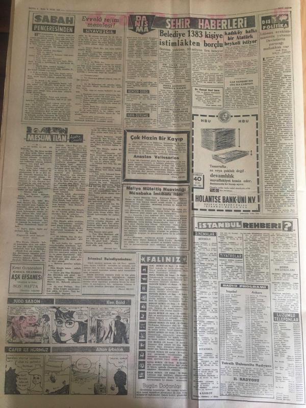 YENİ SABAH GAZETESİ 21 OCAK 1962 YIL :24 SAYI :8212---Sahte fatura ile 5 milyon liralık kaçak mal sokulmuş --Baykam istifa etti ,Çelikbaş 'ın istifasını istendi ---98 Türk bulunan motor büyük bir tehlike atlattı --İnönü iş ve akti ve grev en kuvvetli ilaçtır dedi ---Talebelere karşı polis gazinoyu koruyor --Bekçi ücretine kızıp kendi dükkanını soydu ---4 esrar kaçakçısı 10 milyon ödeyecek --Elia Kazan Şehrimizde ---Evvela rejim meselesi :Siyavuşgil ---Belediye 1383 kişiye istimlakten borçlu ---Liz Taylor ,Kleopatra --Zindan dan kaçtı , zengin olarak can verdi ---En fazla ikramiye veren banka :İş Bankası ---İktisadi Devlet Teşekkülleri İslah Edilecek --Fenerbahçe galip Beşiktaş mağlup ----Yeşildirek iki penaltı ile G.Tepe den 2 puan aldı---İtalya da büyük maç :İnter -Fiorentina ---İstanbul spor ,PTT ' yi ikinci devre yendi :2-1--Ankara da ordu maçı :Türkiye Amerika ---, SAFA KILIÇLIOĞLU tarafından kaleme alınmıştır. Kitap 1962 yılında [YENİ SABAH MATBAA] o ISBN kodu ile yayınlanmıştır. 8 sayfadır. YENİ SABAH GAZETESİ 21 OCAK 1962 YIL :24 SAYI :8212---Sahte fatura ile 5 milyon liralık kaçak mal sokulmuş --Baykam istifa etti ,Çelikbaş 'ın istifasını istendi ---98 Türk bulunan motor büyük bir tehlike atlattı --İnönü iş ve akti ve grev en kuvvetli ilaçtır dedi ---Talebelere karşı polis gazinoyu koruyor --Bekçi ücretine kızıp kendi dükkanını soydu ---4 esrar kaçakçısı 10 milyon ödeyecek --Elia Kazan Şehrimizde ---Evvela rejim meselesi :Siyavuşgil ---Belediye 1383 kişiye istimlakten borçlu ---Liz Taylor ,Kleopatra --Zindan dan kaçtı , zengin olarak can verdi ---En fazla ikramiye veren banka :İş Bankası ---İktisadi Devlet Teşekkülleri İslah Edilecek --Fenerbahçe galip Beşiktaş mağlup ----Yeşildirek iki penaltı ile G.Tepe den 2 puan aldı---İtalya da büyük maç :İnter -Fiorentina ---İstanbul spor ,PTT ' yi ikinci devre yendi :2-1--Ankara da ordu maçı :Türkiye Amerika --- adlı eser Türkçe dilindedir.
