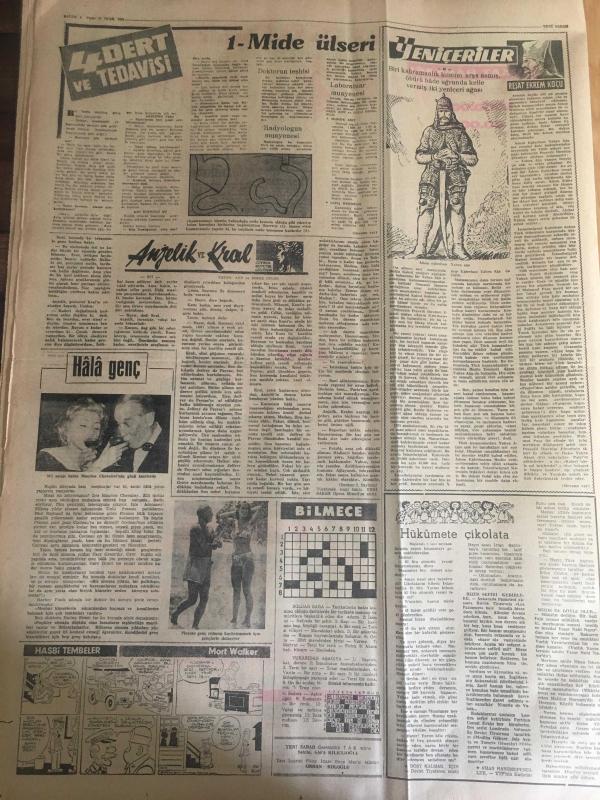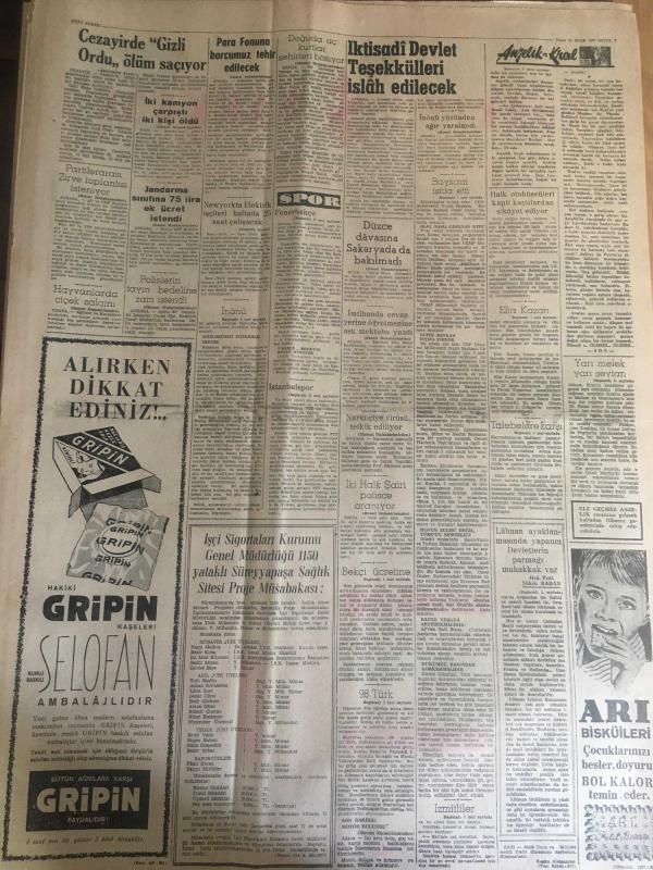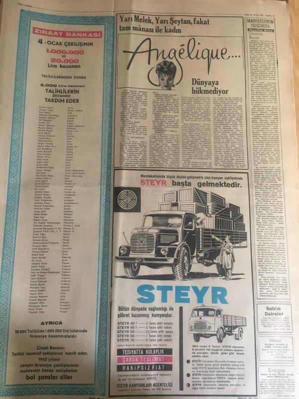 YENİ SABAH GAZETESİ 21 OCAK 1962 YIL :24 SAYI :8212---Sahte fatura ile 5 milyon liralık kaçak mal sokulmuş --Baykam istifa etti ,Çelikbaş 'ın istifasını istendi ---98 Türk bulunan motor büyük bir tehlike atlattı --İnönü iş ve akti ve grev en kuvvetli ilaçtır dedi ---Talebelere karşı polis gazinoyu koruyor --Bekçi ücretine kızıp kendi dükkanını soydu ---4 esrar kaçakçısı 10 milyon ödeyecek --Elia Kazan Şehrimizde ---Evvela rejim meselesi :Siyavuşgil ---Belediye 1383 kişiye istimlakten borçlu ---Liz Taylor ,Kleopatra --Zindan dan kaçtı , zengin olarak can verdi ---En fazla ikramiye veren banka :İş Bankası ---İktisadi Devlet Teşekkülleri İslah Edilecek --Fenerbahçe galip Beşiktaş mağlup ----Yeşildirek iki penaltı ile G.Tepe den 2 puan aldı---İtalya da büyük maç :İnter -Fiorentina ---İstanbul spor ,PTT ' yi ikinci devre yendi :2-1--Ankara da ordu maçı :Türkiye Amerika --- Yıpranma, sararmalar, kupon kesiği ve yırtılmalar zamana bağlı olarak görülebilir.