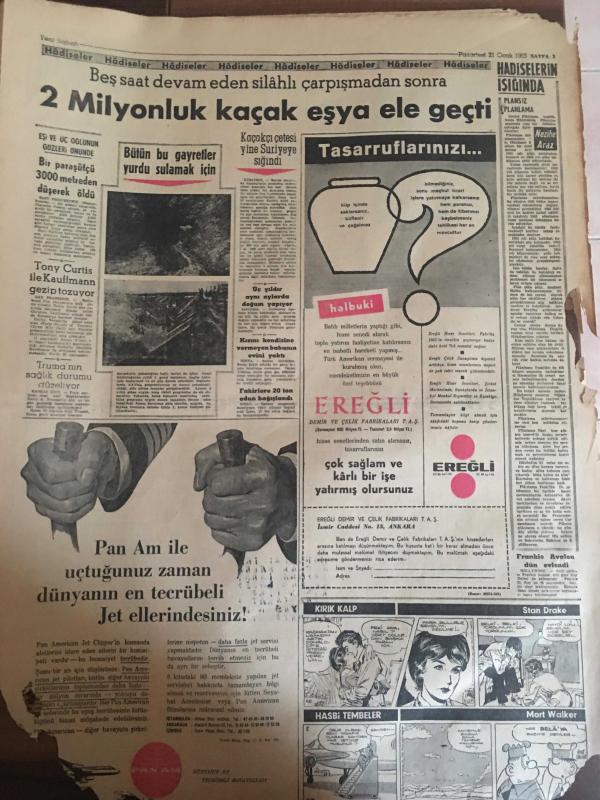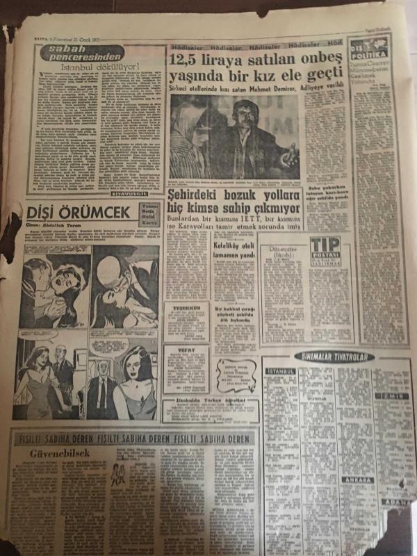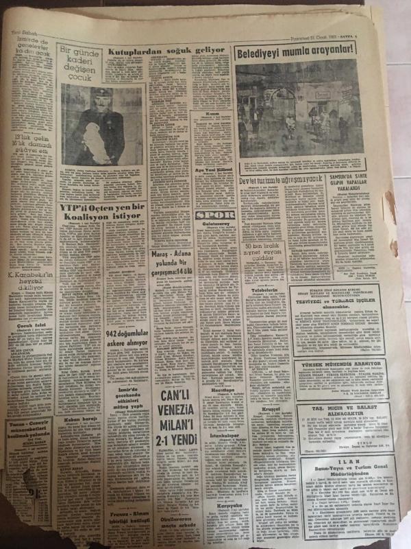 YENİ SABAH GAZETESİ 21 OCAK 1963 YIL :25 SAYI :8572--Devlet Turizmle Uğraşamayacak ---Talebelerin Celal Bayar ı Ziyaretine Müsaade Verilmedi ---Yeni Af Tasarısı Meclise Veriliyor --Kutuplardan yeni bir soğuk dalgası geliyor ---Keban Barajı için Almanya kredi açacak --Aya Yani kilisesi üçüncü defa soyuldu --Kasım Kürtleri teslim olmaya davet etti ---İstanbul Dökülüyor : Siyavuşgil --12,5 liraya satılan on beş yaşında bir kız ele geçti --Şehirde ki bozuk yollara hiç kimse sahip çıkmıyor ---2 Milyonluk kaçak eşya ele geçti ---Orhan Boran ve Küçük Orkestra --Zeki Müren Ramazan da çalışmayacak --Can lı Venezia Milan 2-1 yendi --Milan Bugün Geliyor --Galatasaray ın B kadrosu B.Spor a 3-2 yenildi --Karşıyaka ve Göztepe galip --İst.Spor ,Kasımpaşa ile yenişemedi :1-1--Tehir maçları bugün ve yarın oynanacak ---H.Tepe :1 A.Gücü :1--Çocuk felci vakaları artıyor --- Yıpranma, sararmalar, kupon kesiği ve yırtılmalar zamana bağlı olarak görülebilir.