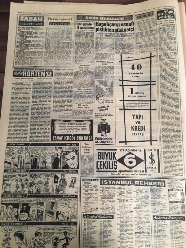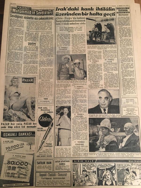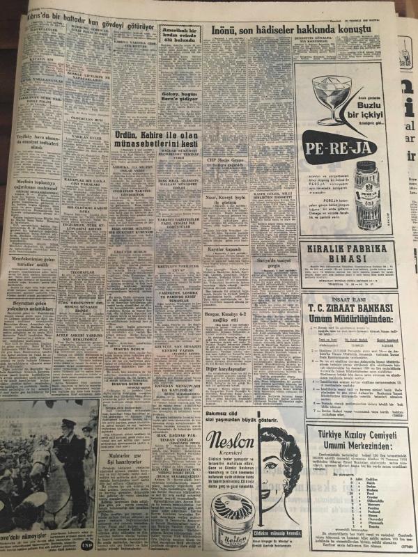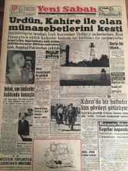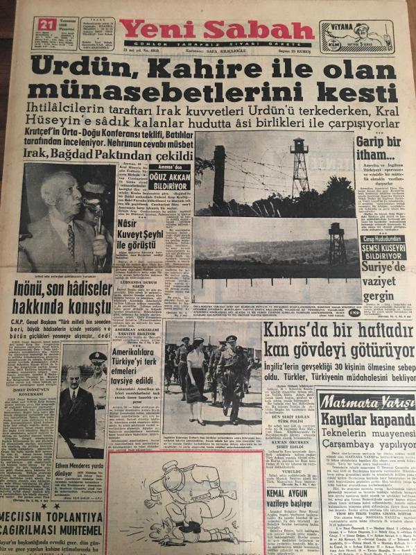 YENİ SABAH GAZETESİ 21 TEMMUZ 1958 YIL :21 SAYI : 6959--Ürdün , Kahire ile olan münasebetlerini kesti ---Nasir Kuveyt Şeyhi ile Görüştü --İnönü ,son hadiseler hakkında konuştu --Amerikalılara Türkiye yi terk etmeleri tavsiye edildi ---Garip bir itham --Suriye de vaziyet gergin --Kıbrıs da bir haftadır kan gövdeyi götürüyor --Meclisin Toplantıya Çağrılması Muhtemel --Haksız Nerede :Siyavuşgil --Kapalı çarşı esnafı pislikten şikayetçi --Irak ' da ki kanlı ihtilalin üzerinden bir hafta geçti ---Hollywood 'un kıskançlık bilmeyen güzel yıldızlar :Kim Novak ---Molnar Fenerbahçe 'den 500 lira fark istiyor --Türkiye ve Rusya Şampiyon Olacaktır --Burgaz ,Kınalı 'yı 4-2 mağlup etti ----Yetkiner Kupası Yelken Yarışları --Nevzat Cengiz :Kazanma şansı metanet ve iradeye bağlıdır diyor --Ordu Takımı Maçları --Tamer Başoğlu --Ankara da yapılan rekor denemeleri ---- Yıpranma, sararmalar, kupon kesiği ve yırtılmalar zamana bağlı olarak görülebilir.