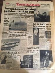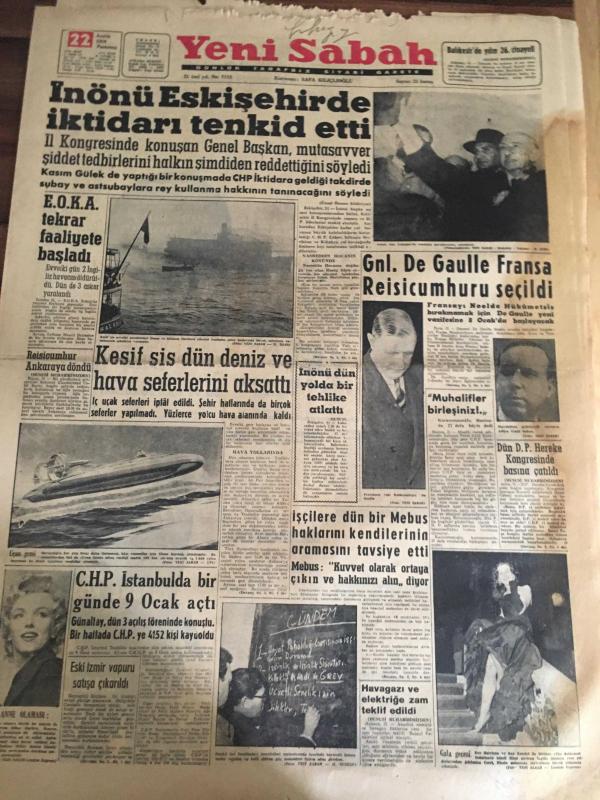 YENİ SABAH GAZETESİ 22 ARALIK 1958 YIL :21 SAYI :7113---İnönü Eskişehir de İktidarı Tenkit Etti ----EOKA Tekrar faaliyete başladı --Keşif sis dün deniz ve hava seferlerini aksattı --Gnl .De Gaulle Fransa Reisi cumhuru seçildi ---CHP İstanbul da bir günde 9 Ocak açtı --Hava gazı ve elektriğe zam teklif edildi ---Kontrolsüzlükten halk ucuz meyve yiyemiyor --Rusya Atom Bombası İmalatını Durduruyor --İnönü Eskişehir de İktidarı Tenkid Etti --Galatasaray ,İ.Spor dan rövanşını aldı :2-1---Fenerbahçe ,Vefa 'yı dün rahat yendi :3-1---Sarıyer :1 Taksim :1-- Yıpranma, sararmalar, kupon kesiği ve yırtılmalar zamana bağlı olarak görülebilir.