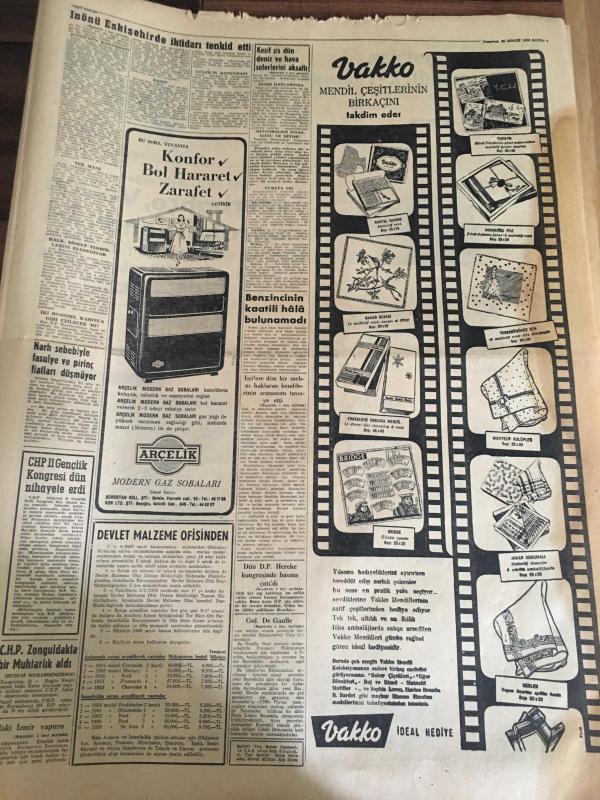 YENİ SABAH GAZETESİ 22 ARALIK 1958 YIL :21 SAYI :7113-Vakko-Arçelik-İhsan Hulusi çizimi Milli Piyango reklamı-Abbase-Hasbi Tembeler-Mayk Hammer--İnönü Eskişehir de İktidarı Tenkit Etti ----EOKA Tekrar faaliyete başladı --Keşif sis dün deniz ve hava seferlerini aksattı --Gnl .De Gaulle Fransa Reisi cumhuru seçildi ---CHP İstanbul da bir günde 9 Ocak açtı --Hava gazı ve elektriğe zam teklif edildi ---Kontrolsüzlükten halk ucuz meyve yiyemiyor --Rusya Atom Bombası İmalatını Durduruyor --İnönü Eskişehir de İktidarı Tenkid Etti --Galatasaray ,İ.Spor dan rövanşını aldı :2-1---Fenerbahçe ,Vefa 'yı dün rahat yendi :3-1---Sarıyer :1 Taksim :1-- adlı eser, Kitap > Süreli Yayınlar > Gazeteler > Türkiye > Genel > Diğer kategorisinde İkinci El olarak satıştadır.