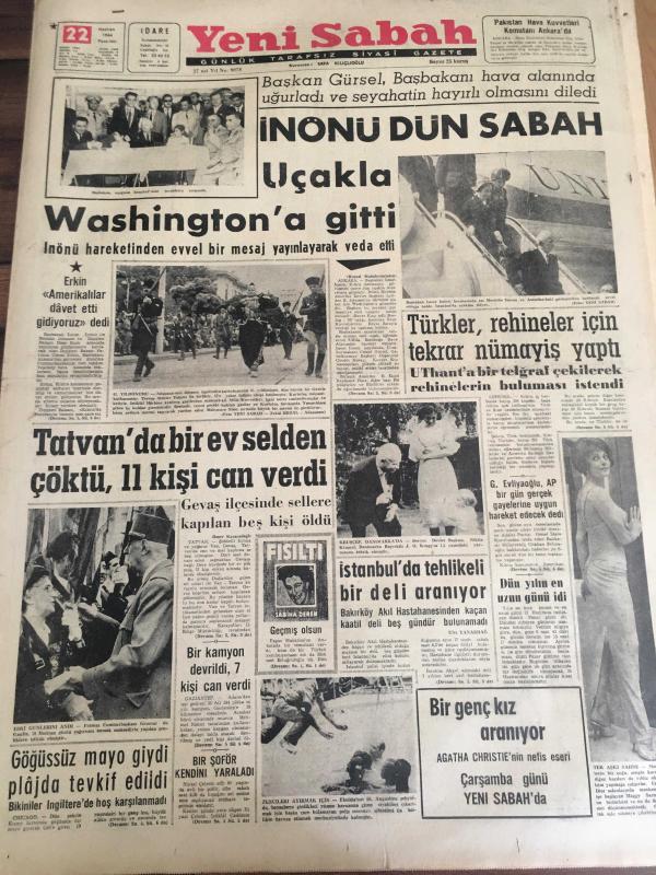YENİ SABAH GAZETESİ 22 HAZİRAN 1964 YIL :27 SAYI :9078----İnönü dün sabah uçakla Washington 'a gitti --Tatvan da bir ev selden çöktü , 11 kişi can verdi --Türkler rehineler için tekrar nümayiş yaptı --İstanbul da tehlikeli bir deli aranıyor --Castro ya göre demokrasi rejimlerin en gericisidir --Kızılay kamplarından 8 bin talebe faydalanacak --Churcill 'in hayatını İngilizler filme aldılar ---Özel okullar tasarısı --Alsancak ta oynayan kupa finalinin ilk maçında :Galatasaray :0 Altay :0 --Kampa 21 güreşçi daha davet edildi --Temmuz ayına bir hafta kala transfer faaliyeti hızlandı --Can : Fiorentina da bu yıl da oynayacağım diyor --Ordular arası maçla Fransa B. Almanya 'yı 2-1 yendi --Macaristan Danimarka 'yı 3-1 mağlup etti -- Yıpranma, sararmalar, kupon kesiği ve yırtılmalar zamana bağlı olarak görülebilir.