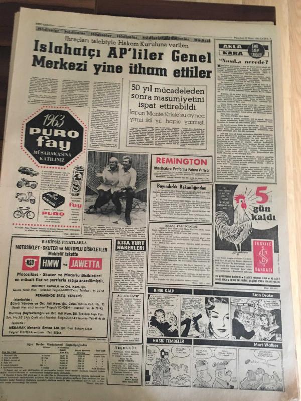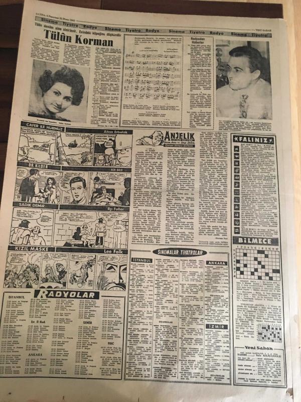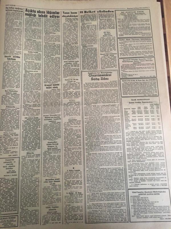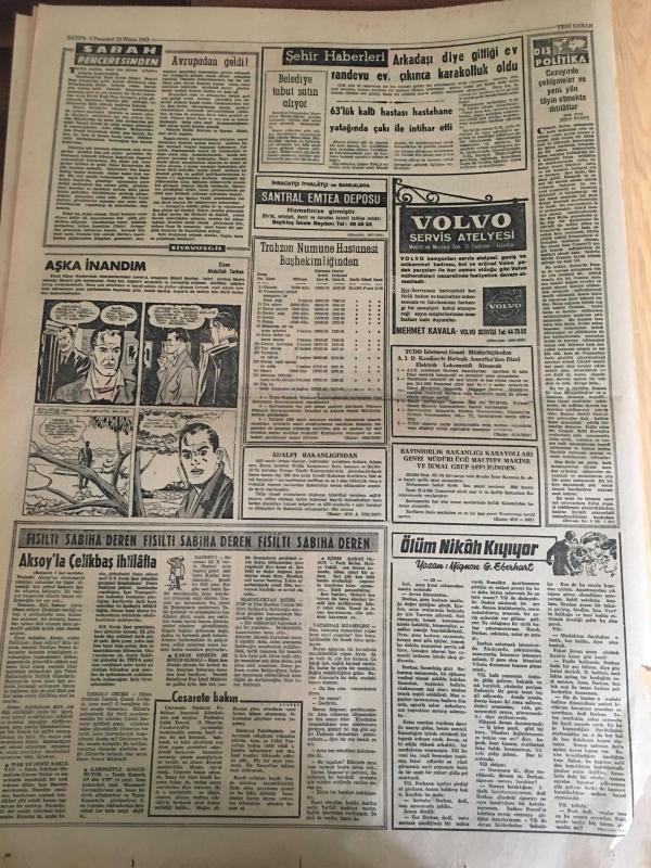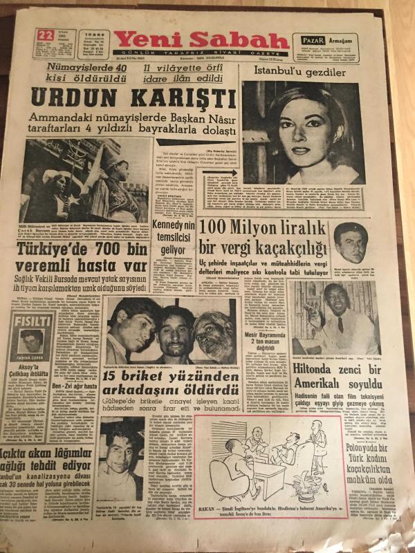 YENİ SABAH GAZETESİ 22 NİSAN 1963 YIL :25 SAYI :8661--Nümayişlerde 40 kişi öldürüldü --Ürdün Karıştı --Türkiye de 700 bin veremli hasta var --100 Milyonluk liralık bir vergi kaçakçılığı --15 briket yüzünden arkadaşını öldürdü --Hilton da zenci bir Amerika lı soyuldu --Avrupa dan geldi :Siyavuşgil --Islahatçı AP 'liler Genel Merkezi Yine İtham Ettiler --Sinemalar :Atlas : Siyah ipekli Casus ,İnci :İki Kocalı Kadın, Konak : Sahte Sevgili ,Lale :Asi Ruhlar ,Şan :Badem Şekeri ,Ünal :Parisin Esrarı ----Fenerbahçe 'nin ilk galibiyeti İzm .Spor dan aldı :1-0--Beşiktaş K. Yaka 'yı 2-0 Yendi --Serbestte İran 'a 4-2 mağlup olduk ---Fenerbahçe galibi D. Spor ,K.Paşa 'ya yenildi : 2-1--Altay :1 Beykoz :0--G.Birliği ,H. Tepe ile puanları paylaştı :1-1--- Yıpranma, sararmalar, kupon kesiği ve yırtılmalar zamana bağlı olarak görülebilir.