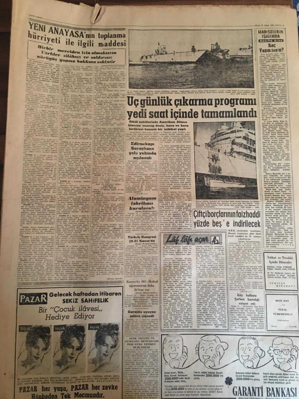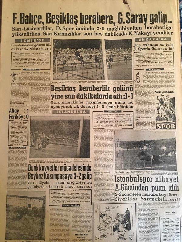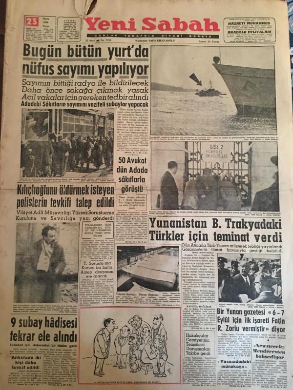 YENİ SABAH GAZETESİ 23 EKİM 1960 YIL :23 SAYI :7765--Bugün bütün yurt da nüfus sayımı yapılıyor --Kılıçlıoğlunu öldürmek isteyen polislerin tevkifi talep edildi --50 Avukat dün adada sakıtlarda görüştü --Yunanistan B.Trakya da ki Türkler için teminat verdi --9 Subay hadisesi tekrar ele alındı --Bir Yunan gazetesi 6-7 Eylül için ilk işareti Fatih R.Zorlu vermiştir diyor ---Seyirci Hasbi Bey :Siyavuşgil --İstanbul Rehberi ---Üç günlük çıkarma programı yedi saat içinde tamamlandı --Çiftçi borçlarının faiz haddi yüzde beş indirilecek ---Tiyatro :Neler gördük ? Neler göreceğiz?--Fenerbahçe ,Beşiktaş berabere ,Galatasaray galip --Beşiktaş beraberlik golünü yine son dakikalarda atı :1-1--Denk kuvvetler mücadelesinde Beykoz Kasımpaşa ya 3-2 galip ---İstanbulspor nihayet A.Gücünden puan aldı --- Yıpranma, sararmalar, kupon kesiği ve yırtılmalar zamana bağlı olarak görülebilir.